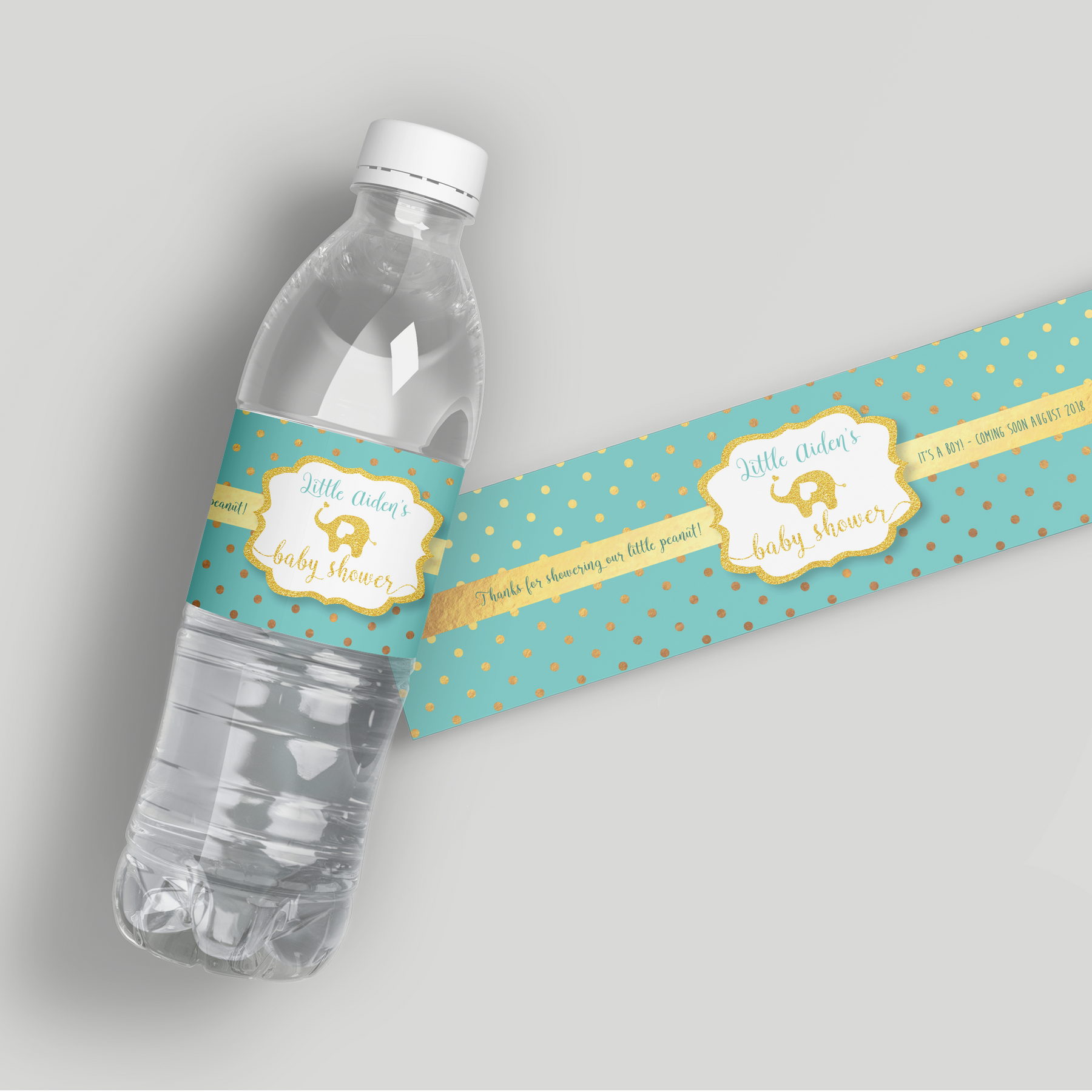Sweet as a nut! Welcome the little peanut. These custom water bottle labels feature an adorable elephant or peanut motif, perfect for a gender-neutral, sweet, or animal-themed baby shower. They add a charming, cohesive touch to your beverage station. Printed on waterproof vinyl, they are fully ice-bucket ready.