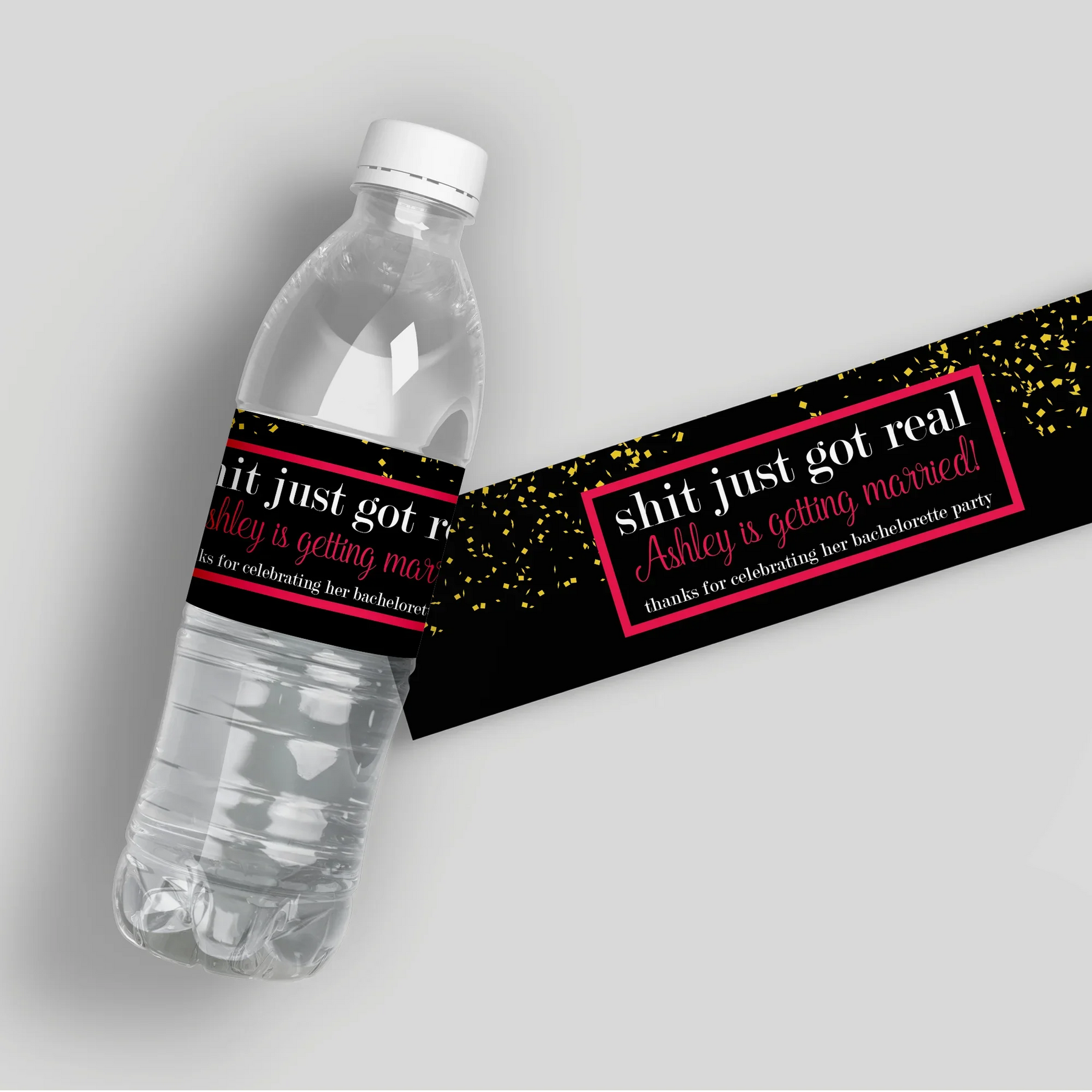 The perfect realization: The wedding is close! These custom water bottle labels feature the humorous, bold slogan "It Just Got Real" or "Engaged to Married," making them the ultimate favor for bachelorette parties and bridal showers. They add a fun, high-energy, and cheeky touch to your celebration's beverage station. Printed on waterproof vinyl, they are fully ice-bucket ready.