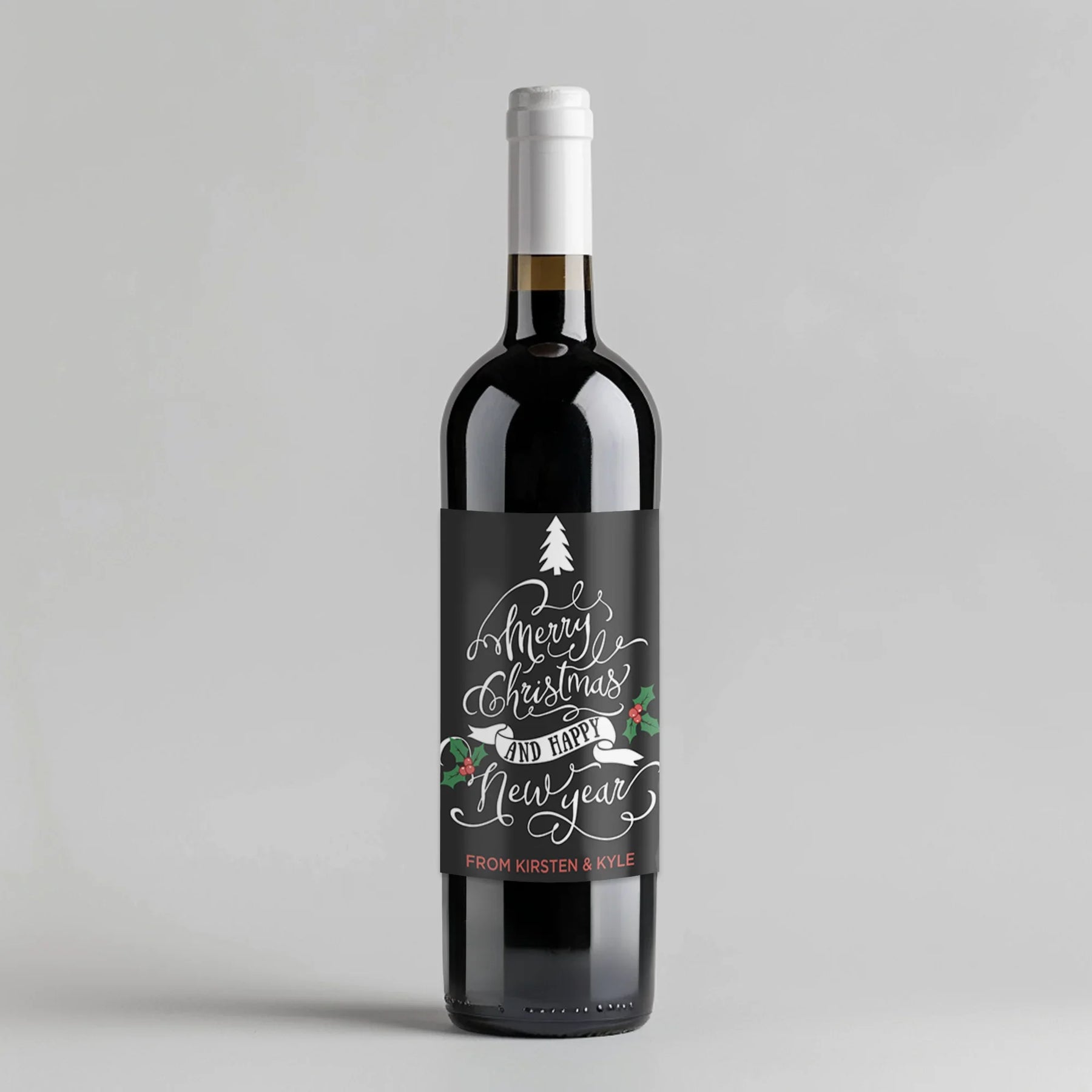 Traditional holly berry design. A timeless look for your Christmas dinner wine.