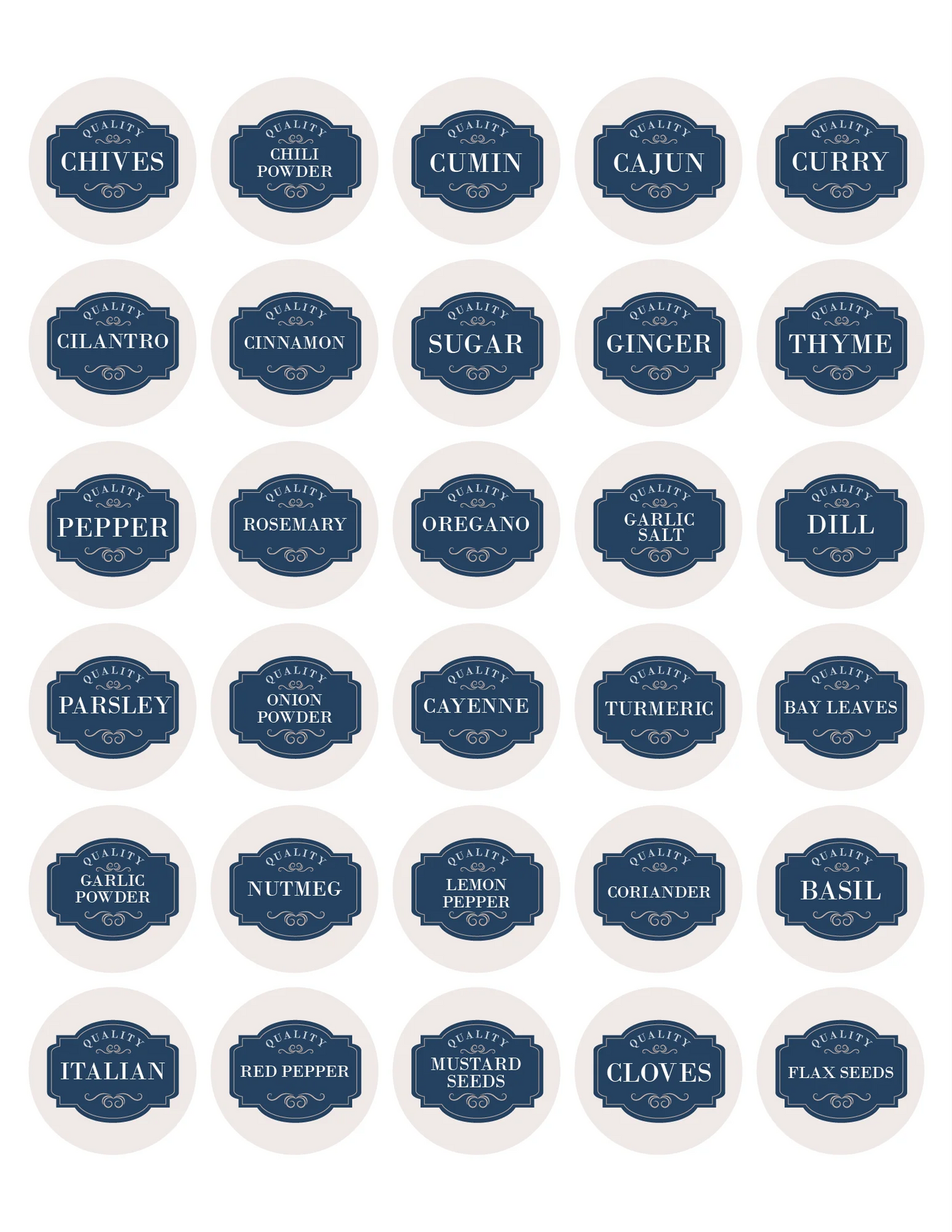 Organize with a pop of color. These Classic Frame Navy Spice Labels feature a deep navy blue border and text on a glossy white background. This set of 30 offers a crisp, clean look that pairs beautifully with white kitchens.