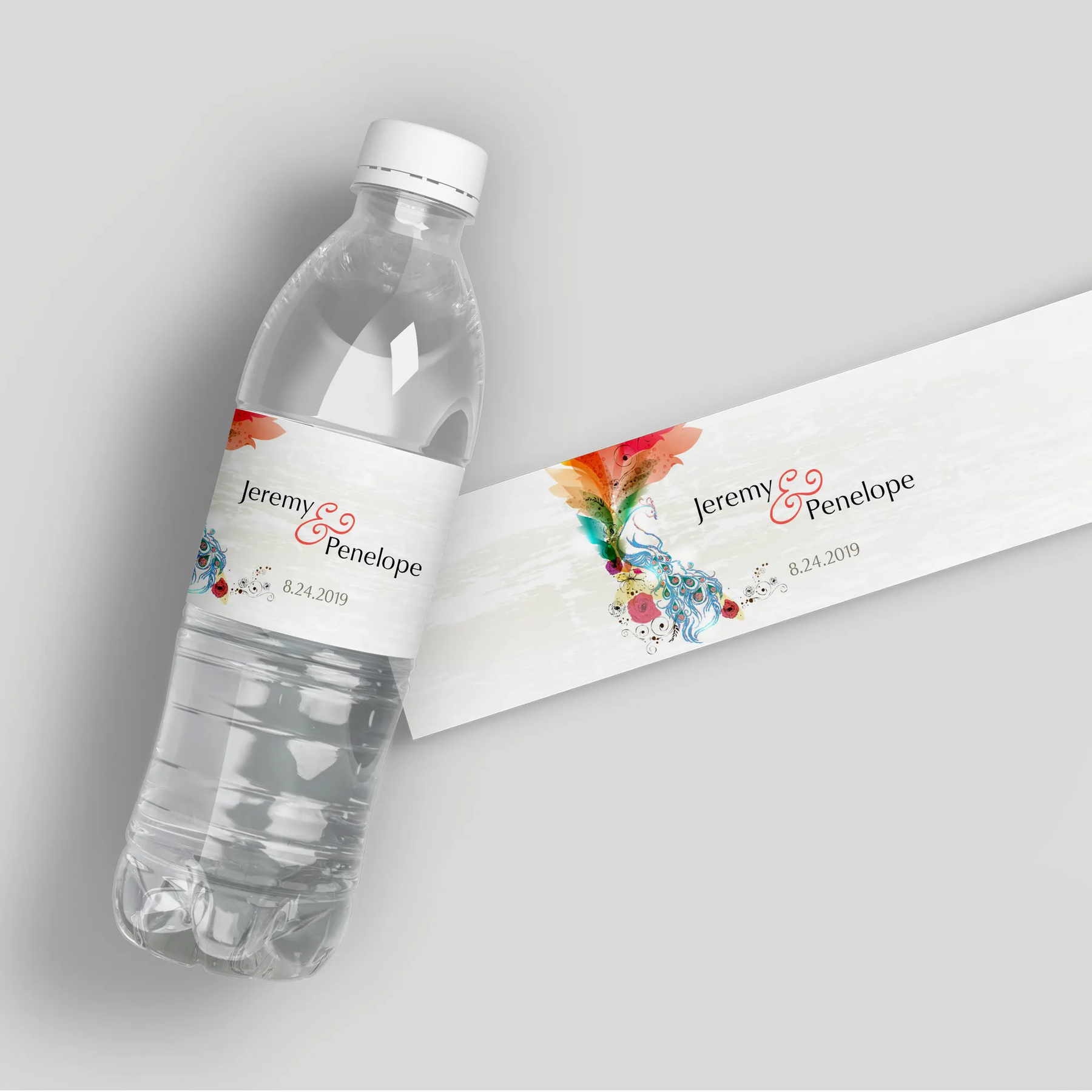Regal, vibrant style for a dramatic celebration. These custom water bottle labels feature a prominent peacock motif. They are the perfect favor for a glam wedding, elegant birthday, or corporate gala, adding a dramatic, luxurious touch to your beverage station. Printed on waterproof vinyl, they are fully ice-bucket ready.