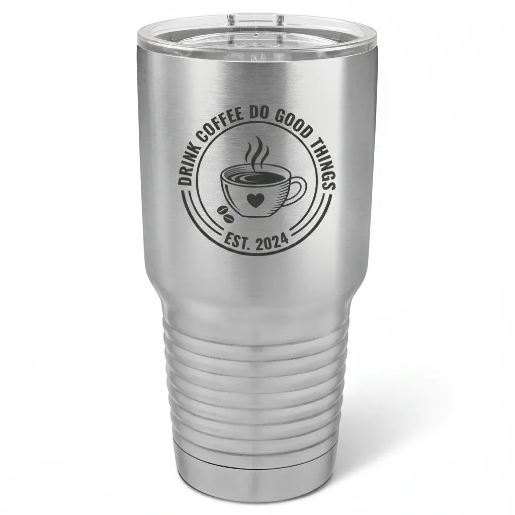 This is where your creativity begins. Our **30oz insulated tumbler** is the perfect blank canvas for your personal touch. Made from premium, food-grade stainless steel, this classic travel mug is ready to be transformed with a **custom laser-engraved design**, a special message, or your company logo.