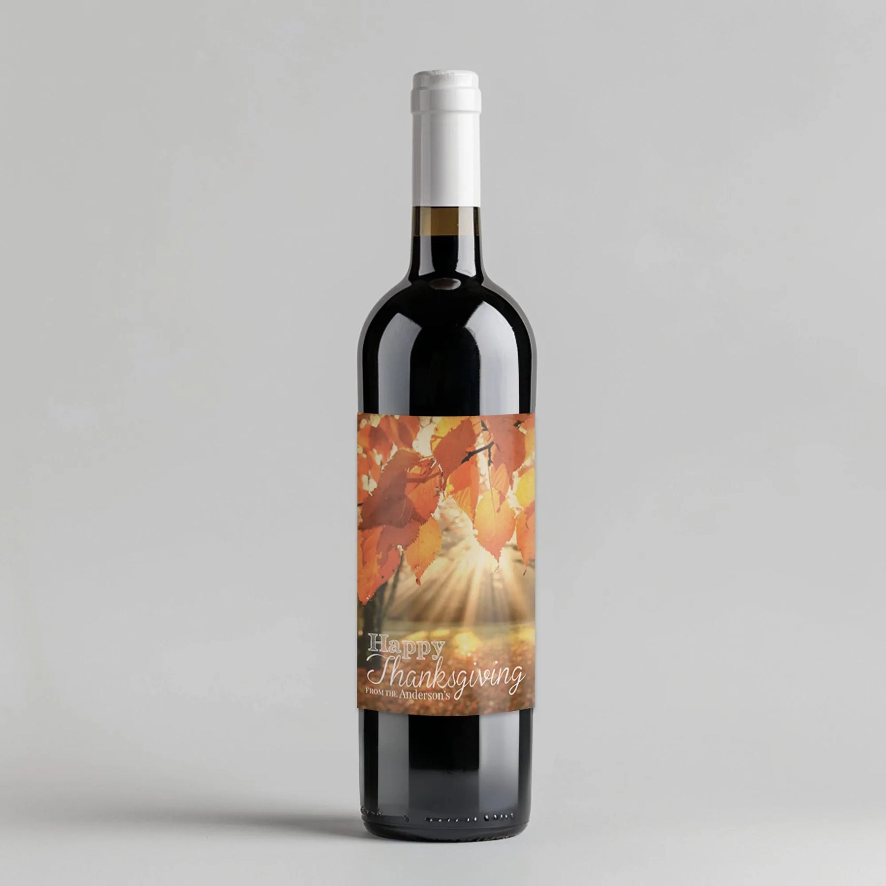 Toast to a Happy Thanksgiving with our Autumn Leaves Wine Label! Featuring a beautiful Autumn day, this label is the perfect addition to your holiday festivities. Personalize it with your own from name for a unique touch. Cheers to a joyous season!