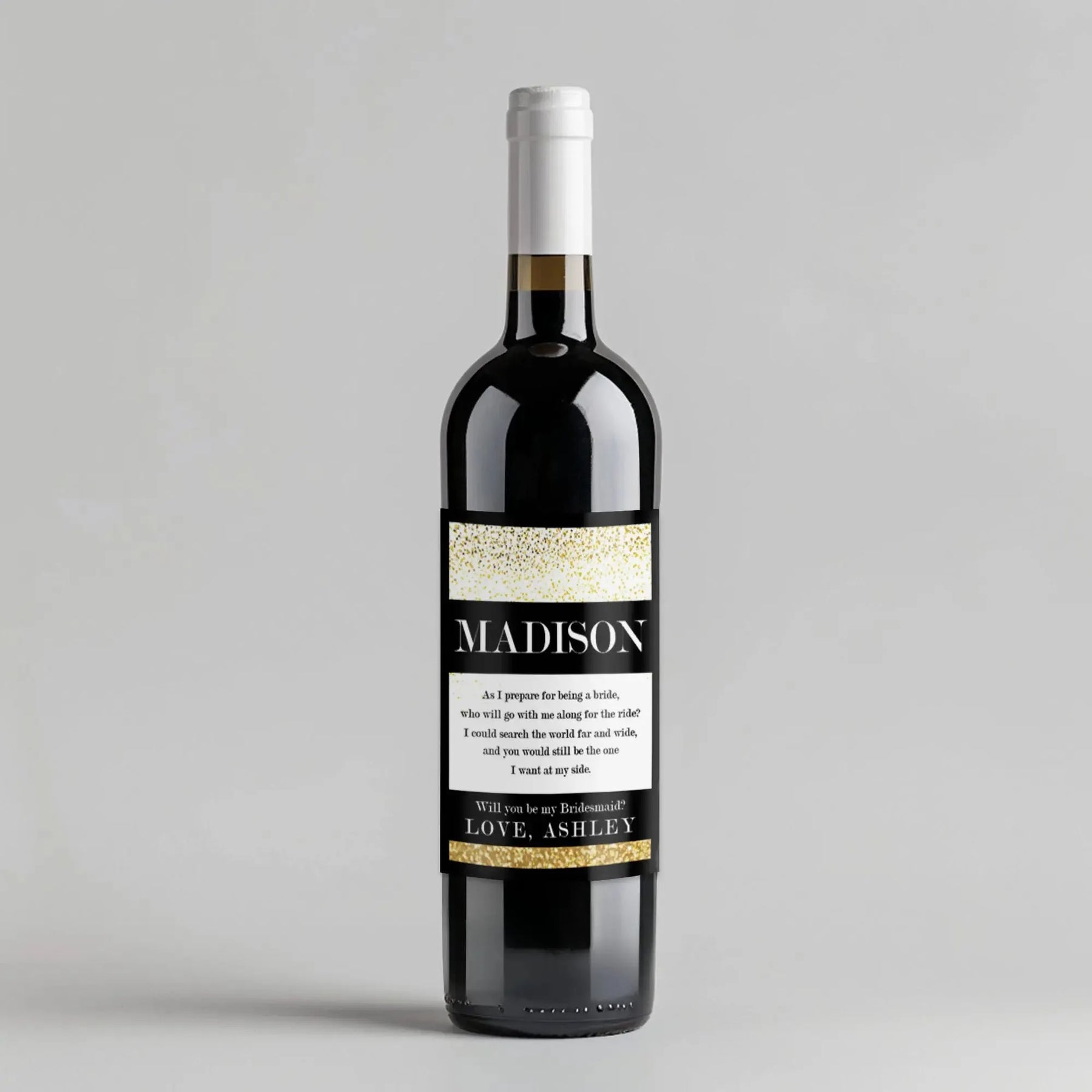 Get your bestie by your side with this personalized Bridesmaid Wine Label! Featuring elegant black and gold design, it's perfect for wedding invitations. And with a heartfelt poem in the middle, it makes a thoughtful and unique gift.