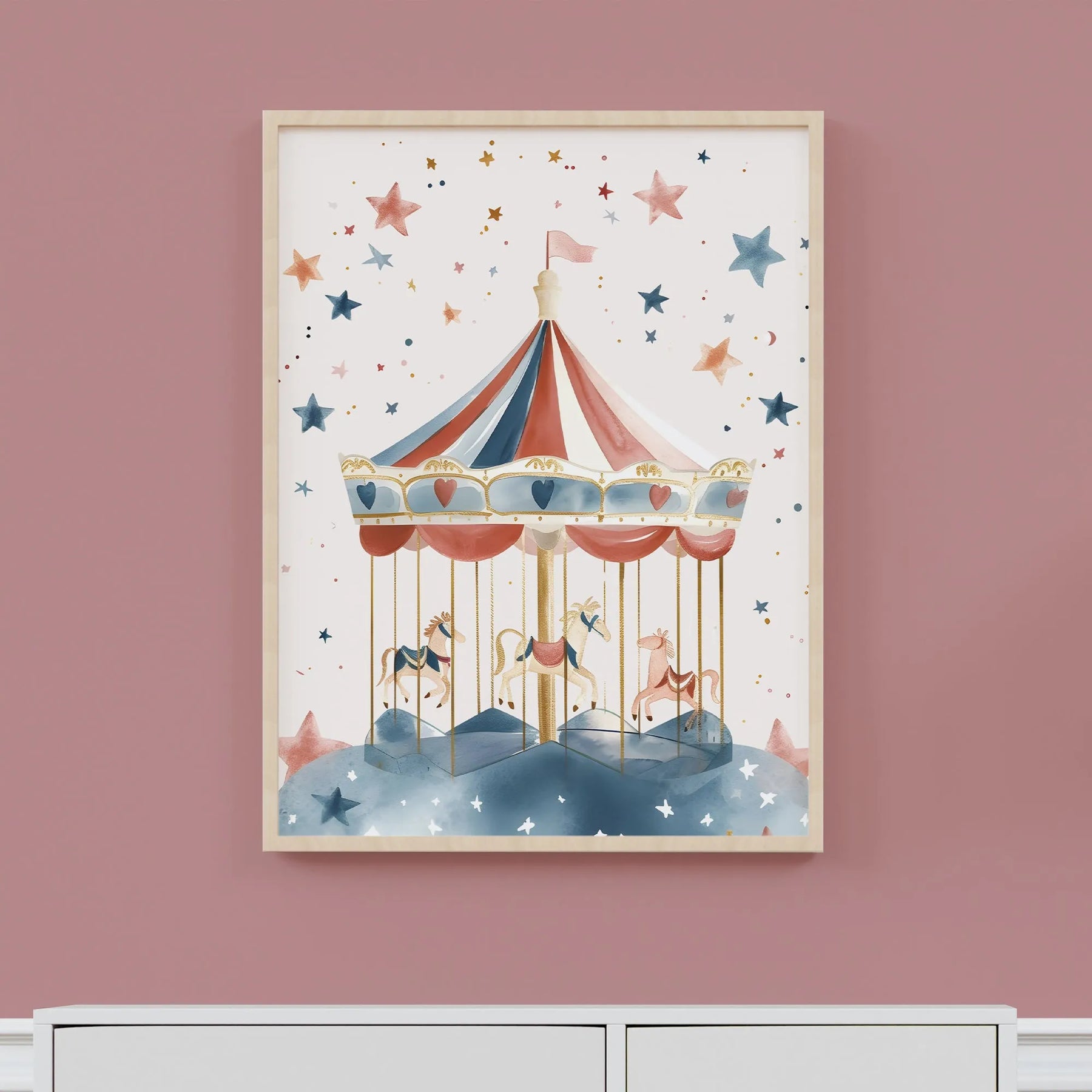 Add a touch of whimsy and fun to your nursery with our Carousel Nursery Poster. Featuring a classic carousel with beautiful horses, hearts, and a starry sky, this playful and charming wall art is perfect for creating a magical atmosphere in any kids room. The soft pastel colors and dreamy design will inspire joy and imagination.