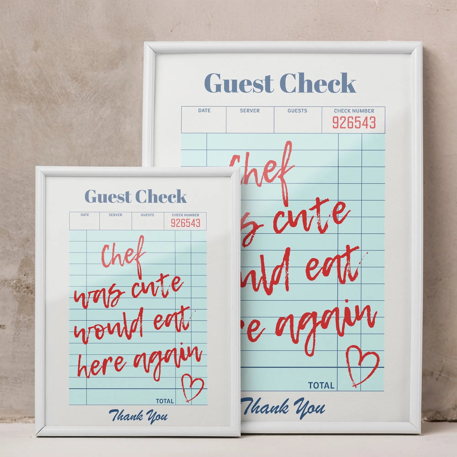 Serve up some playful personality with our Chef Cute Guest Check Poster. Showcasing the pun-filled phrase "chef was cute would eat here again" on a vintage-style guest check, this poster adds a touch of whimsy to any dining room or kitchen. Bon appétit!