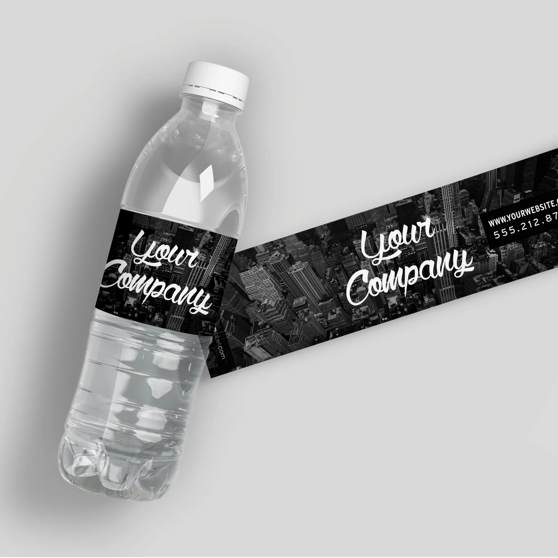Promote your business with City Business Water Bottle Labels. These professional labels are ideal for corporate events and meetings, featuring a sleek cityscape design. Customize with your company's name, website and phone number.