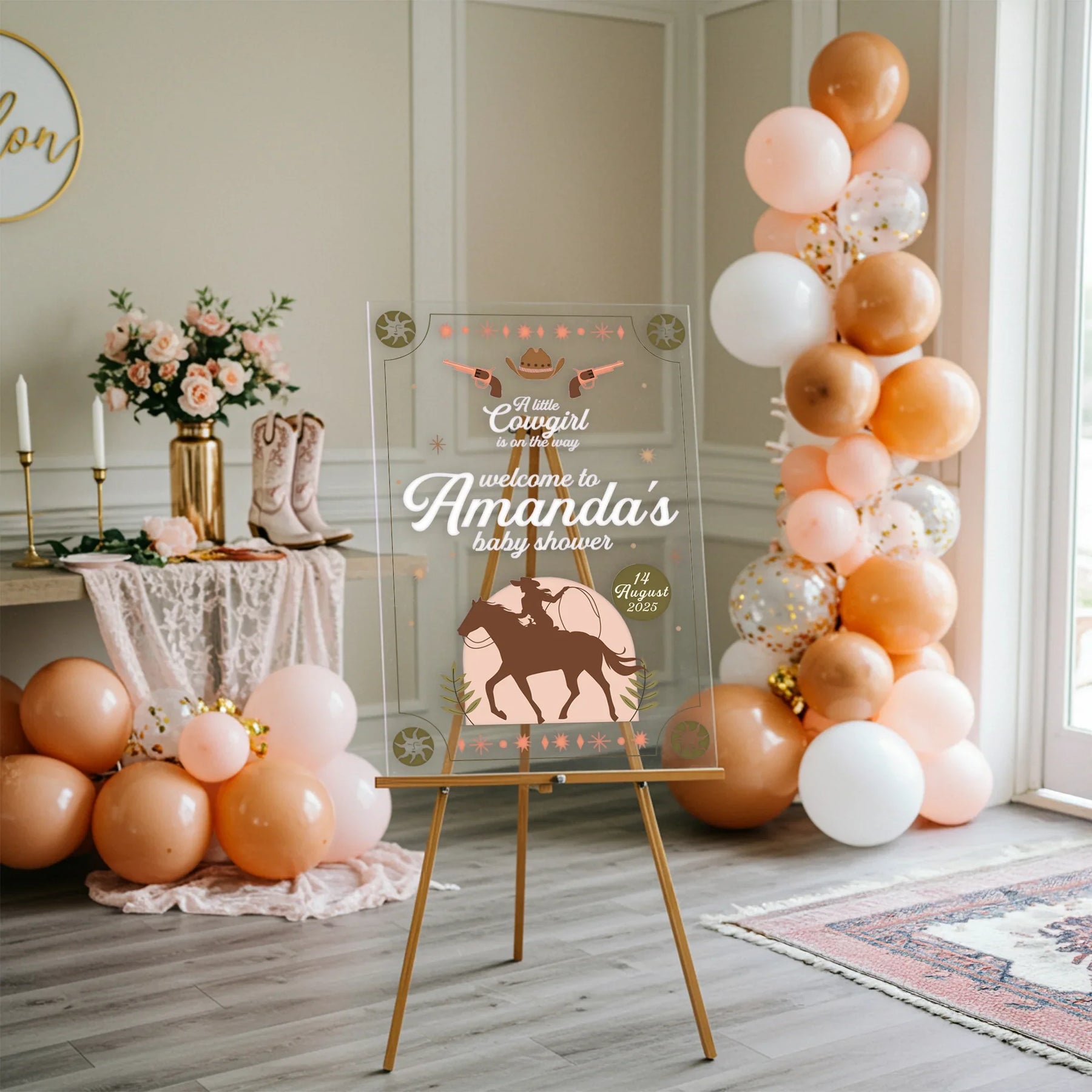 Boots, bows, and a little cowgirl on the way! Saddle up for the sweetest celebration with this custom Western-themed welcome sign. Featuring adorable watercolor illustrations of pink cowboy boots and floral accents, this acrylic sign captures the trending "Cowgirl Chic" aesthetic perfectly. It is the ultimate greeting for a "Boots and Bows" shower, a gender reveal, or a rustic barn celebration.