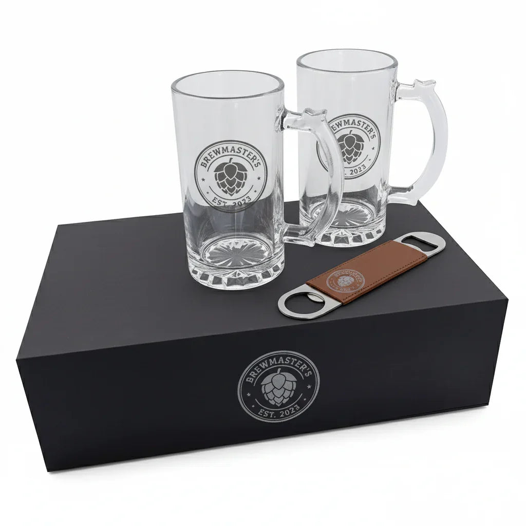Celebrate any occasion in style with our custom engraved beer mug gift box set. Perfect for birthdays, weddings, corporate gifts, or client appreciation, this premium set includes two heavy-duty glass beer mugs and a custom engraved leather bottle opener, all beautifully packaged in a sleek black gift box ready to present.