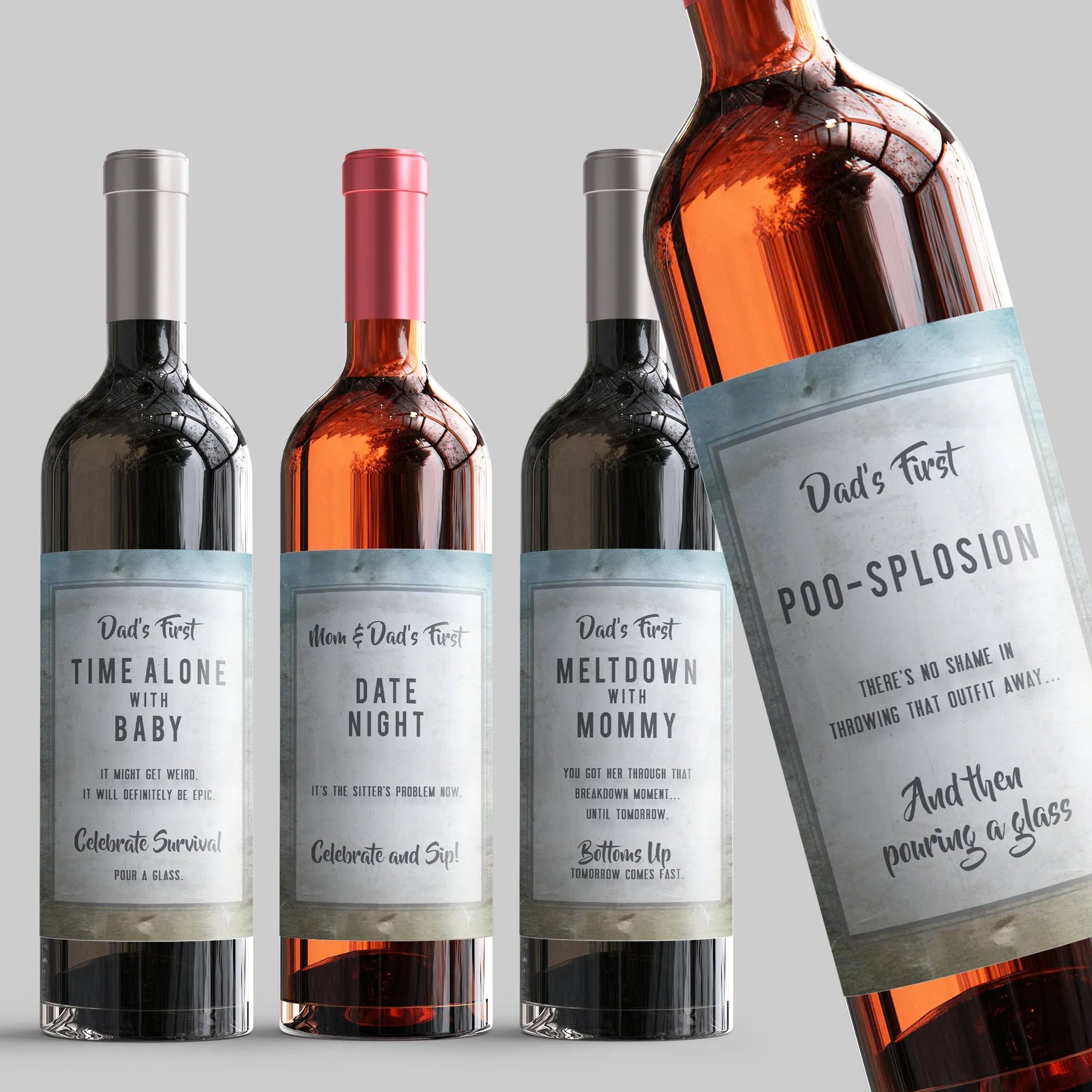 Celebrate the firsts of fatherhood with our Daddy Firsts Wine Label Set. This funny and humorous gift is perfect for any gathering or party and is sure to make dad laugh with phrases like "poo-splosion" and "first dad night." Cheers to all the fun and chaos of being a new parent.