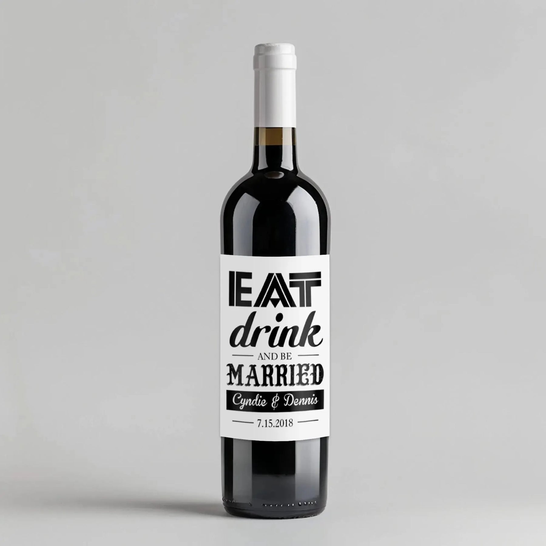 Celebrate love with our personalized Eat Drink and Be Married Wine Label! Featuring elegant black lettering on a white label, this makes for a perfect wedding or bridal shower gift. Add names and dates for a truly unique and thoughtful touch. Cheers to the happy couple!
