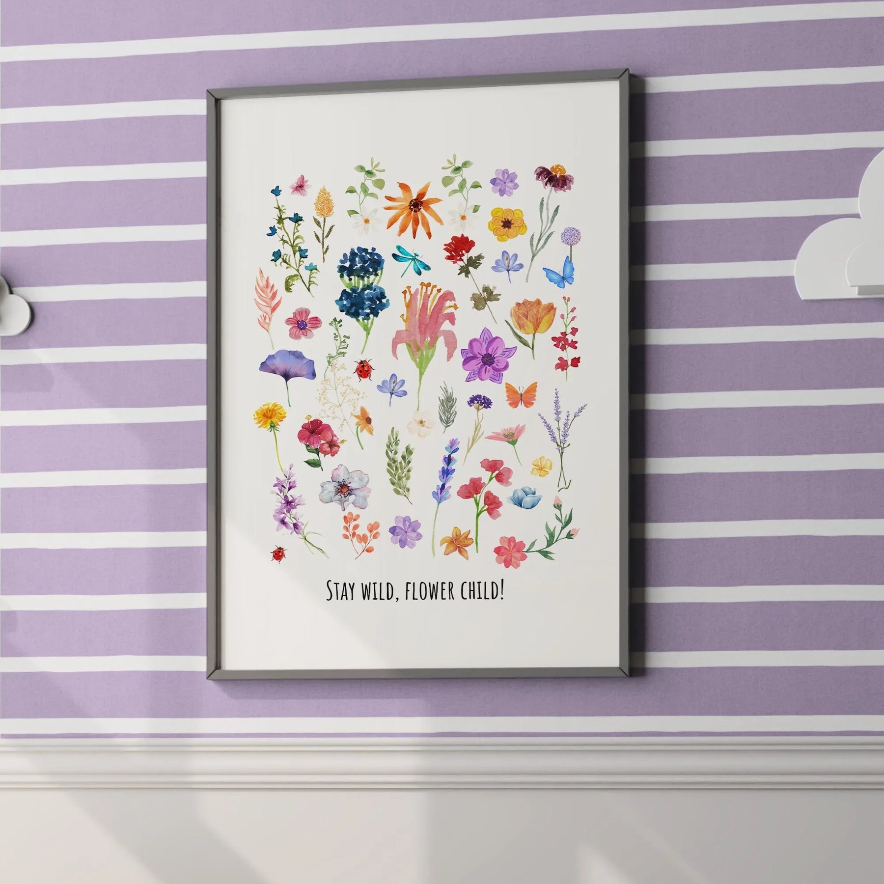 Add a burst of color and positivity to your nursery with our Flower Child Nursery Poster. Featuring a vibrant array of wildflowers and an inspiring "Stay Wild, Flower Child!" quote, this cheerful wall art is perfect for bringing an energetic and nature-inspired vibe to any kids room. Its bright, playful design makes it an ideal addition to any child's space.