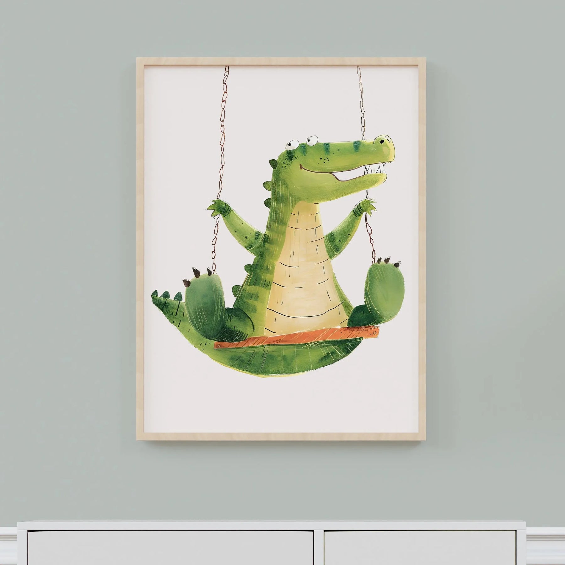 Add a playful touch to your nursery with our Gator Swing Nursery Poster. Featuring a charming alligator happily swinging on a wooden swing, this fun and whimsical wall art is perfect for creating a lighthearted and joyful atmosphere in any kids room. The vibrant colors and cheerful design make it an ideal addition to your child's space.