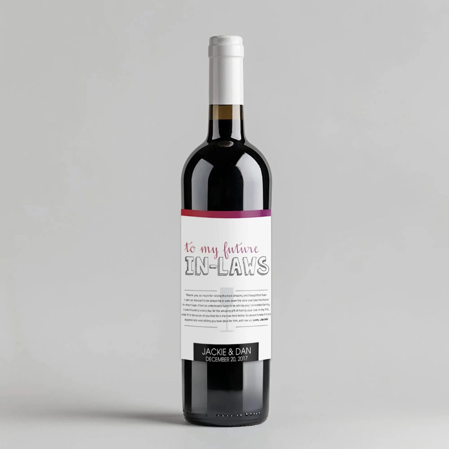 Celebrate the newlyweds' in-laws with these personalized wine labels. Perfect for the wedding day or as a thoughtful gift, these labels add a special touch to any bottle. Cheers to the new family!