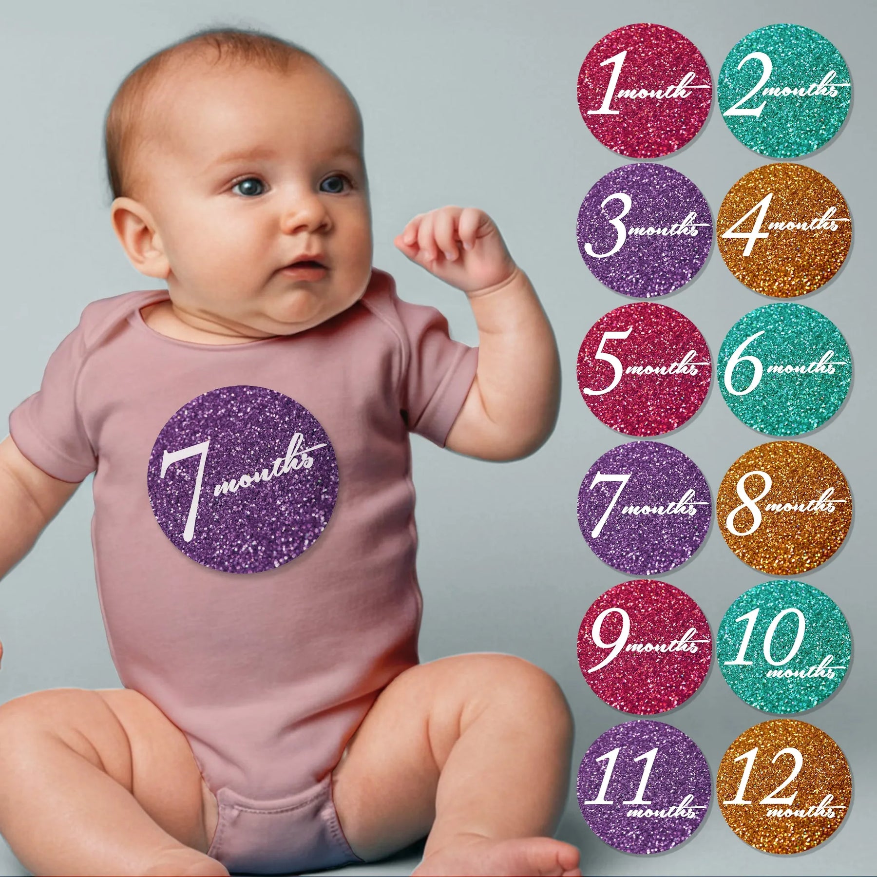 Add a touch of sparkle to your baby's monthly photos with these Glitter Baby Month Stickers. With a variety of vibrant colors, these stickers will make each milestone shine even brighter. Capture and cherish every moment with these fun and festive stickers.