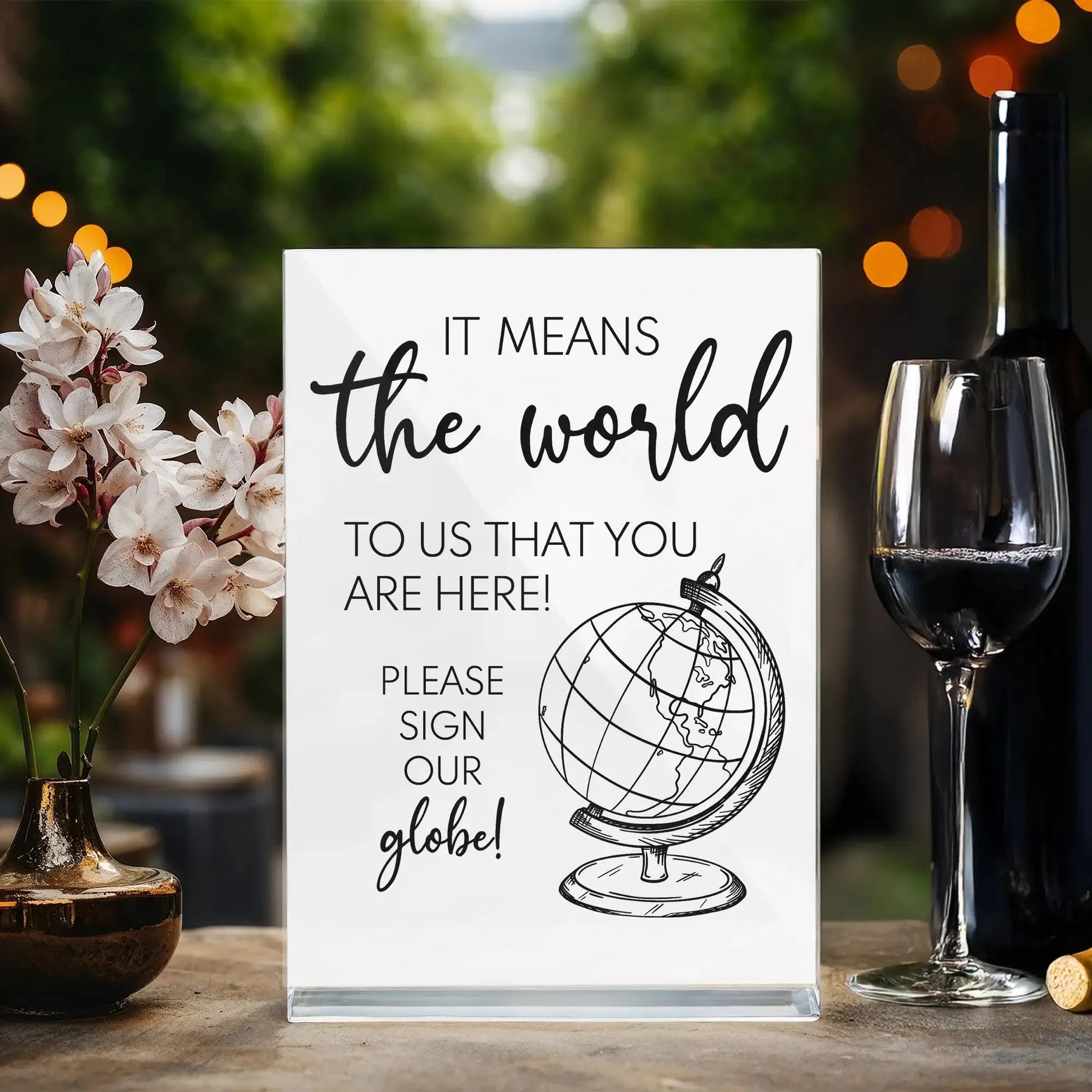 Leave a mark on our Globe Guestbook Wedding Table Sign - a small acrylic sign that invites guests to leave well wishes and signatures on our globe. A creative twist on traditional guestbooks for a unique touch to your special day. Let the globe-trotting memories begin!