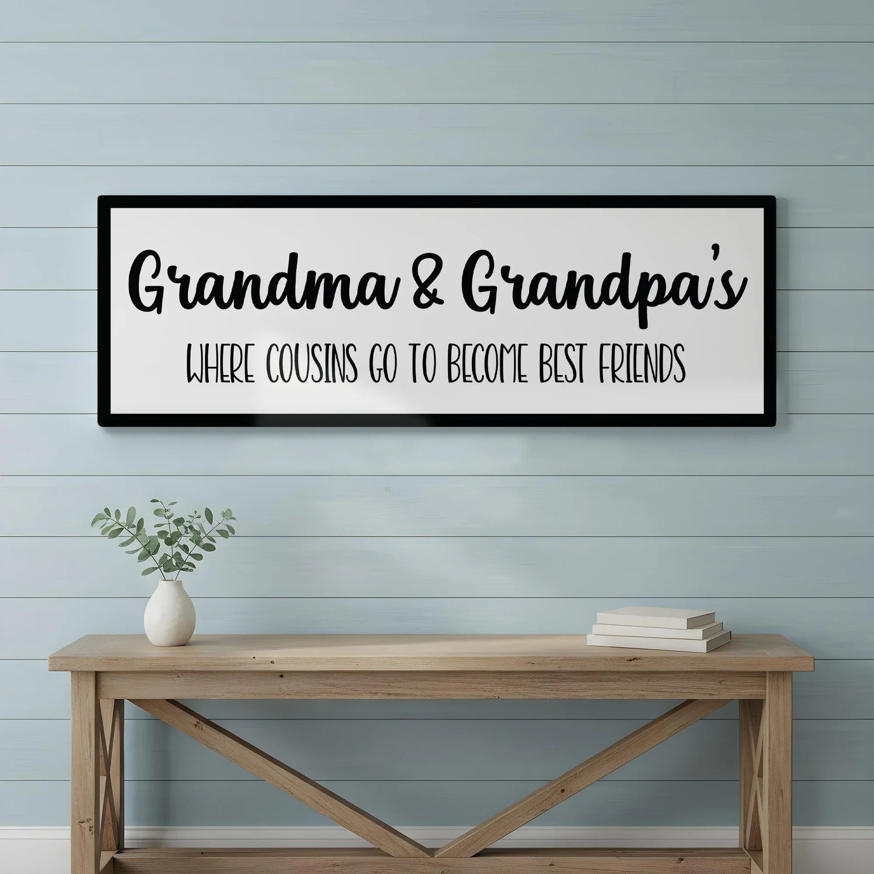 Celebrate the special bond between cousins at grandma and grandpa's place with this charming wood printed sign. Perfect for family gatherings, playrooms, or cabin décor, it captures that magical feeling when cousins transform into lifelong best friends. A heartfelt addition to grandparents' homes that honors family connections and creates smiles every time it's displayed.