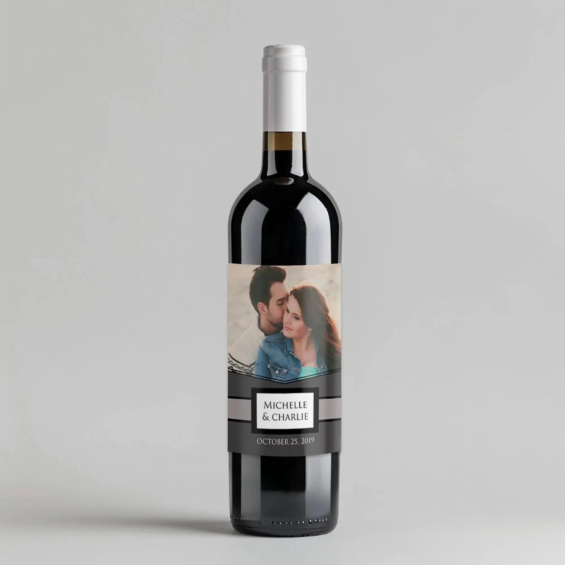 Add a personal touch to your special day with our Gray Photo Wedding Wine Label. Perfect for labeling your wine bottles, this custom label adds a unique touch to your wedding. Share a photo and make a toast with our playful label (cheers!).