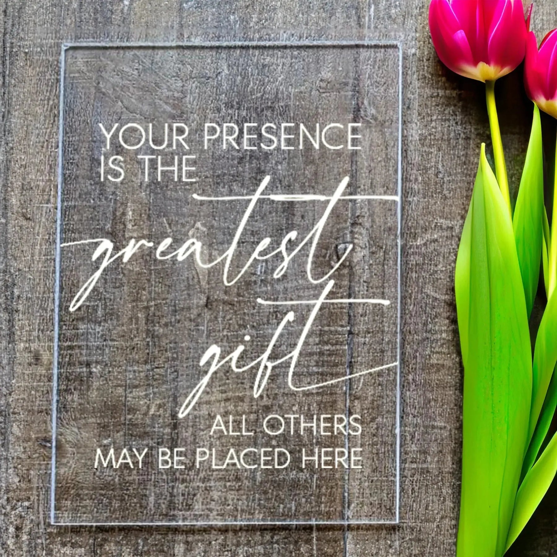 Highlight the joy of having guests with this fun and quirky table sign. Let them know their presence is the greatest gift of all, but if they insist on giving more, they can place it here. Made of small acrylic, it's a charming addition to any wedding table.