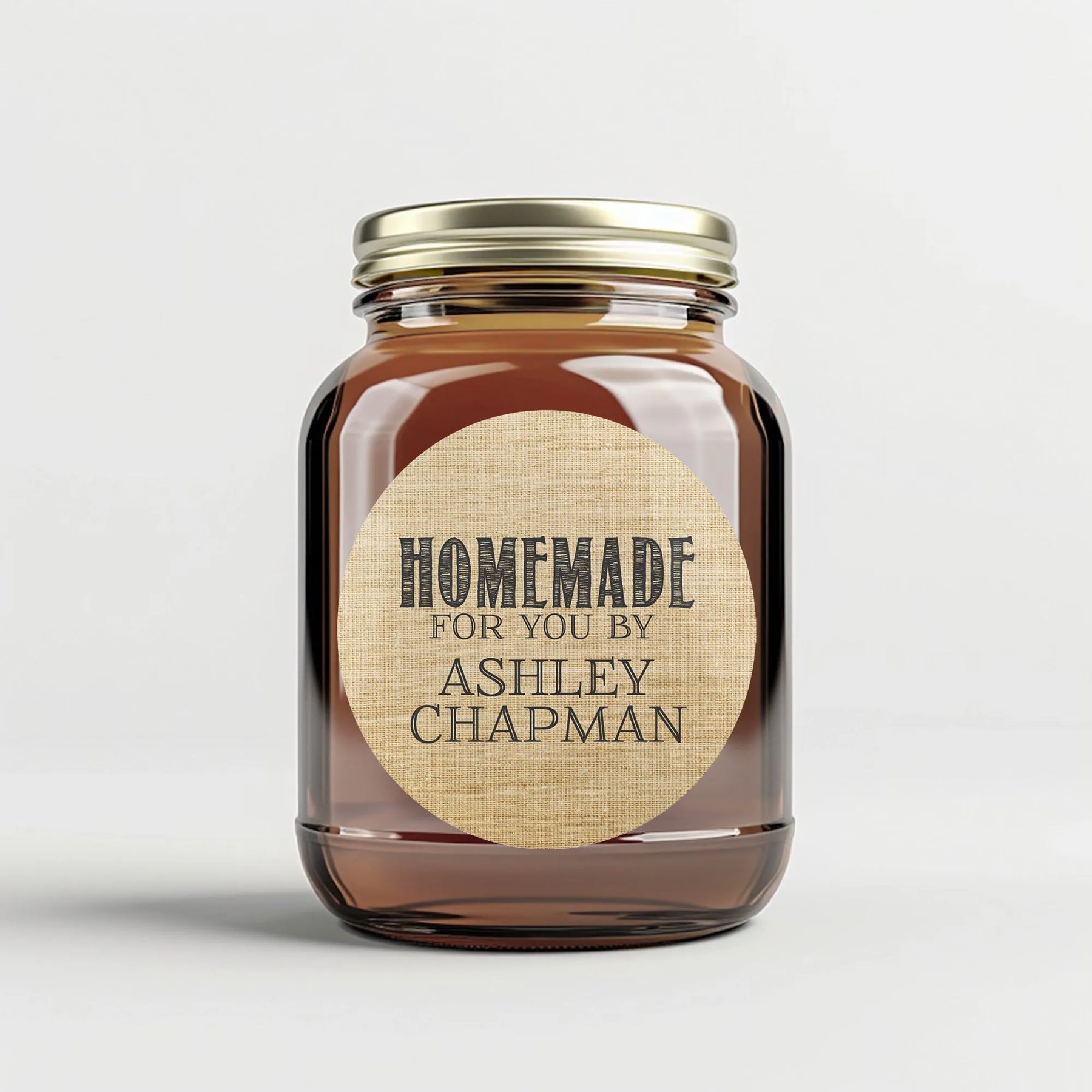 Add a personal touch to your homemade preserves with these charming canning labels! Each label features a rustic burlap printed background paired with your custom name, making every jar uniquely yours. Perfect for gifting homemade jams, jellies, and pickles to friends and family. These durable labels stick securely and bring that handmade warmth to your kitchen creations. Make your pantry look as good as it tastes!