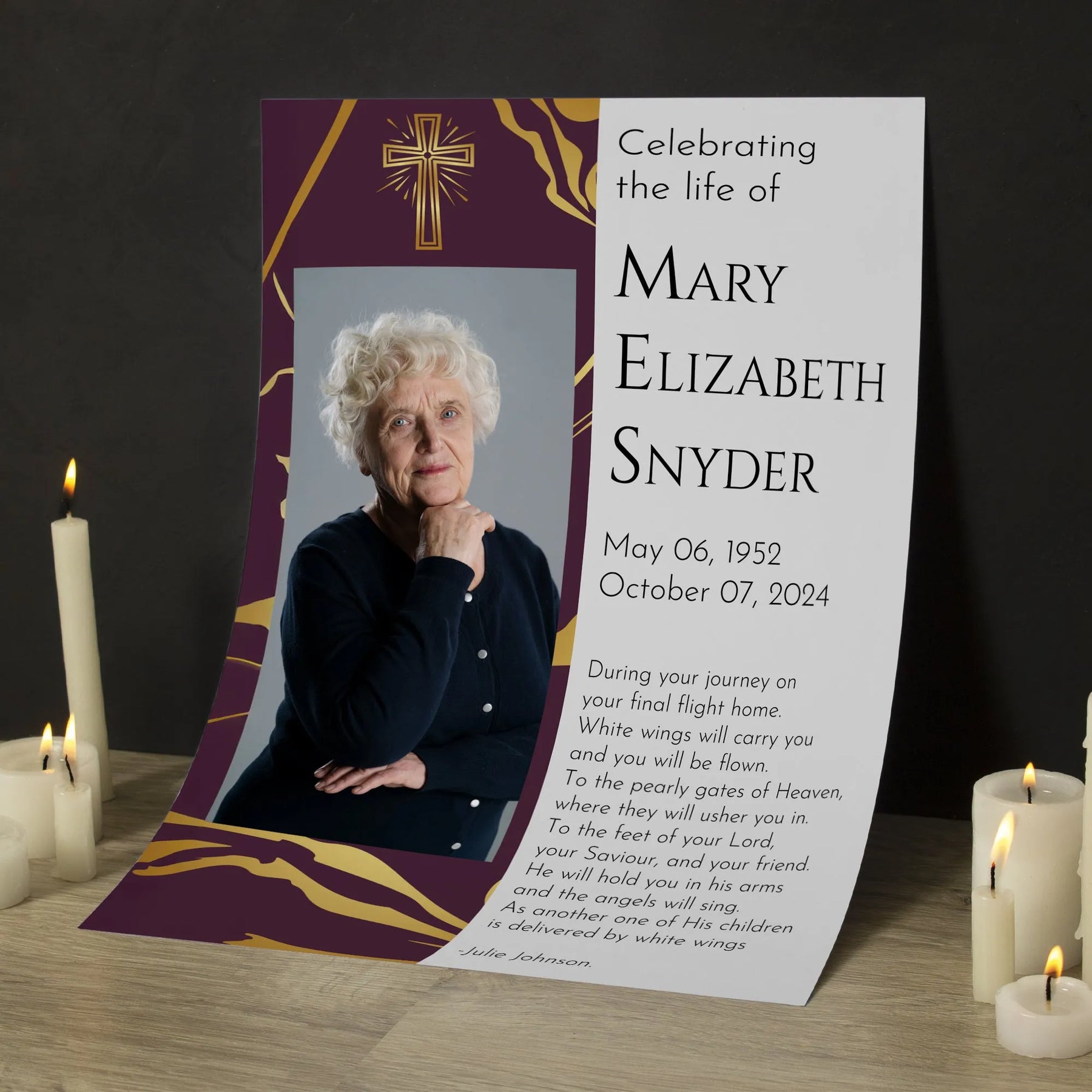Celebrate the life of your loved one with this In Loving Memory Memorial Photo Poster, featuring a royal gold background and an elegant cross. This custom poster design includes a personal photo and can be customized with the name, birth and passing dates, and a heartfelt tribute message. The royal gold and rich tones give it a timeless and dignified feel, perfect for honoring a life well-lived.