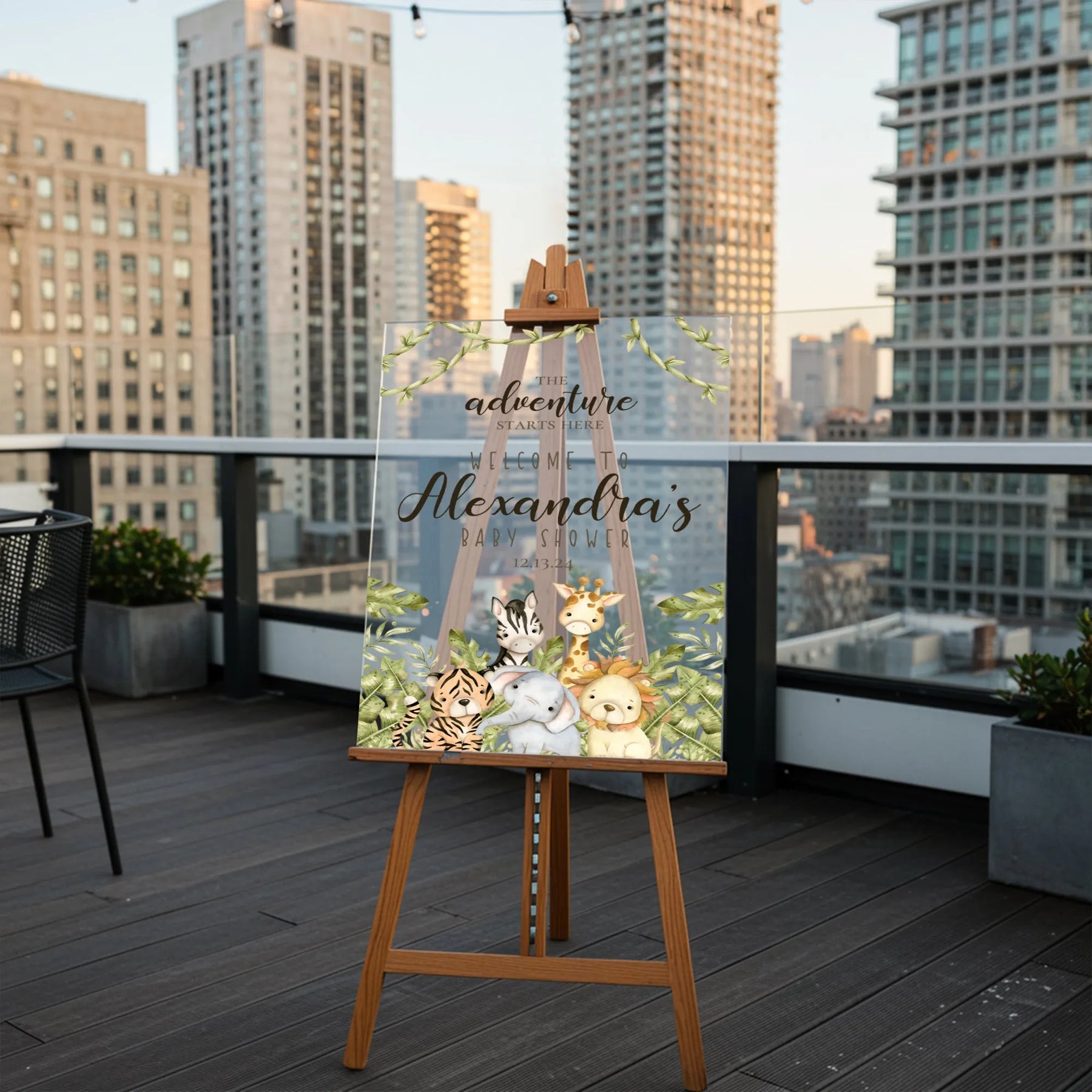 Welcome to the jungle! Set the stage for a roaring good time. Whether you are planning a "Wild One" birthday or a "King of the Jungle" baby shower, this custom welcome sign brings the safari to you. Featuring a charming watercolor gathering of favorite jungle friends—including a lion, elephant, zebra, and giraffe—this premium acrylic sign is the perfect mix of wild fun and sophisticated style.