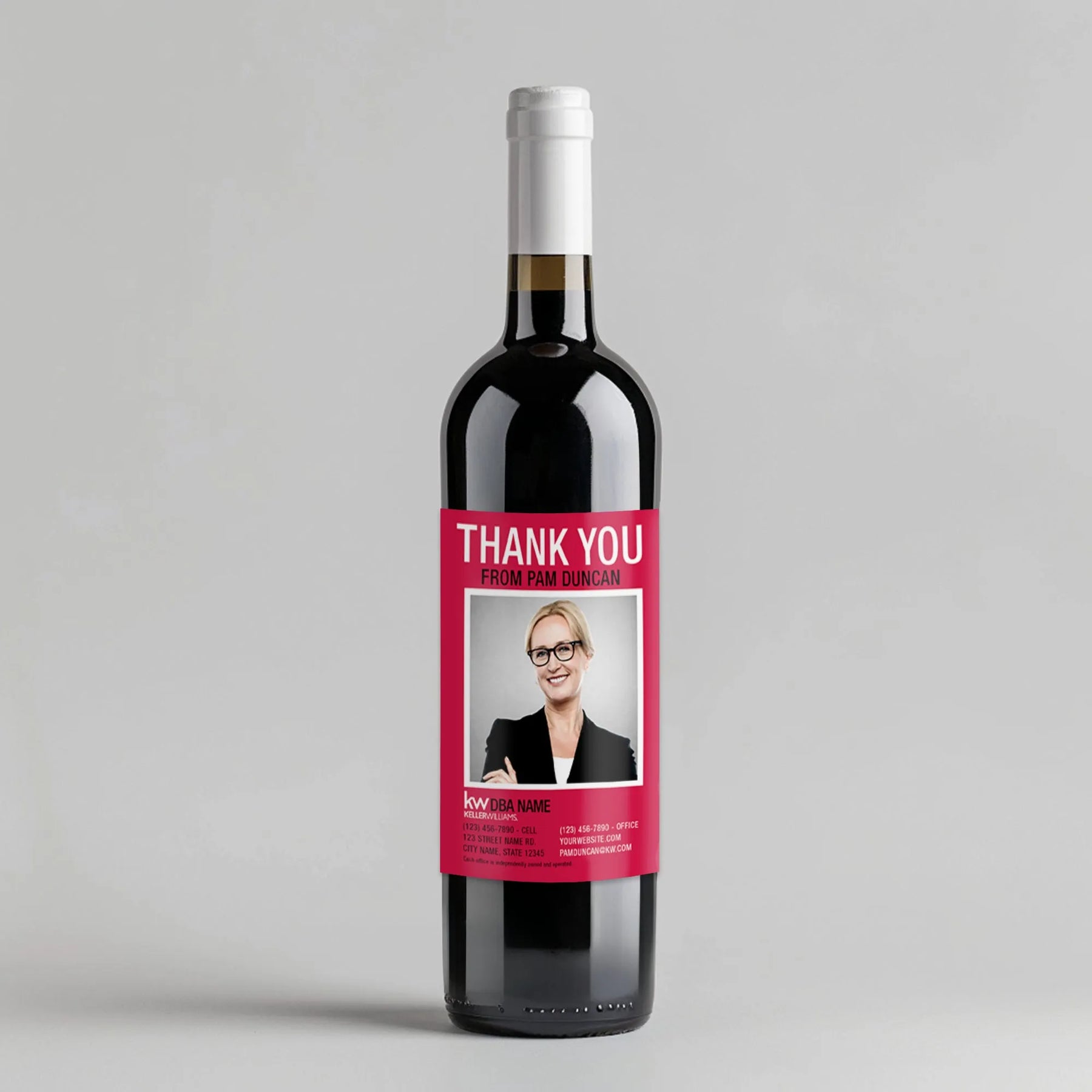 Elevate your real estate game with our personalized Keller Williams Red Photo Realtor Wine Label. Show off your unique brand with a stunning red label that features your own photo. Impress clients and colleagues with this one-of-a-kind touch. Cheers to success in style!