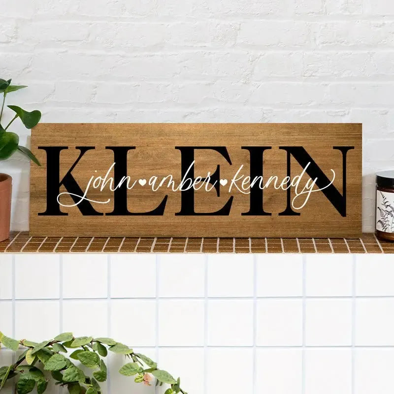 Introducing our fabulous Last Names Wood Sign! Made from high-quality wood, this quirky plank sign prominently displays your family name with the names of the family for a personalized touch. A must-have for any household, it adds a unique touch to your home decor. Get yours today and make your family name stand out!