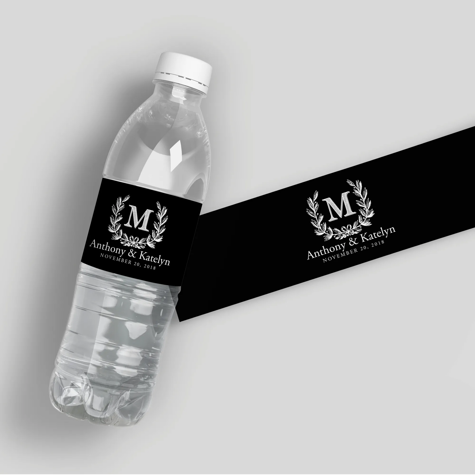 Add elegance to your event with Monogram Wreath Black Water Bottle Labels. Featuring a sophisticated black monogram wreath design, these labels are perfect for weddings and upscale gatherings. Customize with names, initial and date.