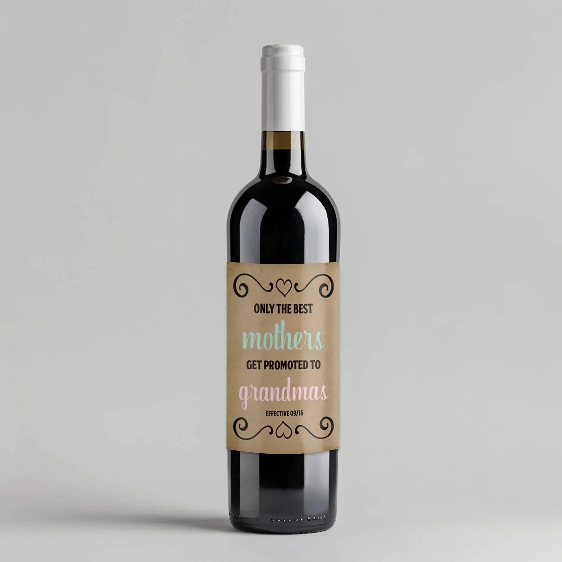 Cheers to the newest addition to the family with our Mothers Promoted Wine Label! This label celebrates the promotion of mom to grandma with a fun and playful twist. Raise a glass and celebrate the future grandma in style.