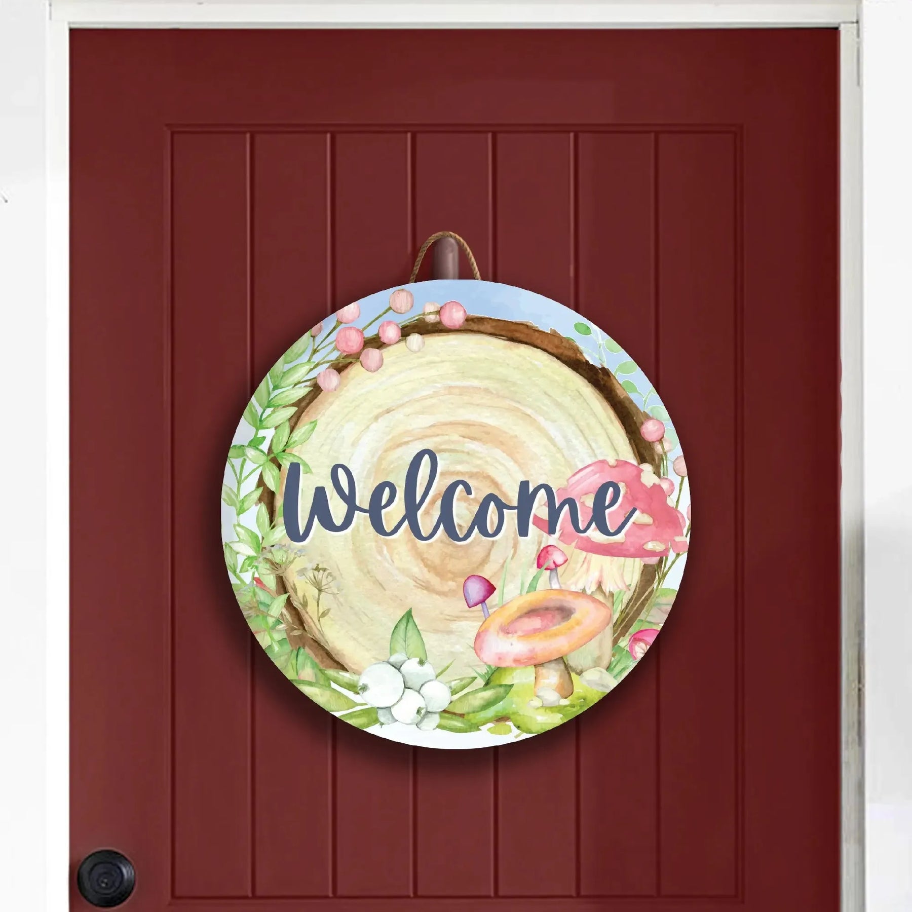 Welcome guests into your home with this Mushroom Welcome Front Door Decor! This wood round sign features a charming image of mushrooms, berries and a cut tree, adding a touch of whimsy to your entryway. Perfect for nature lovers.