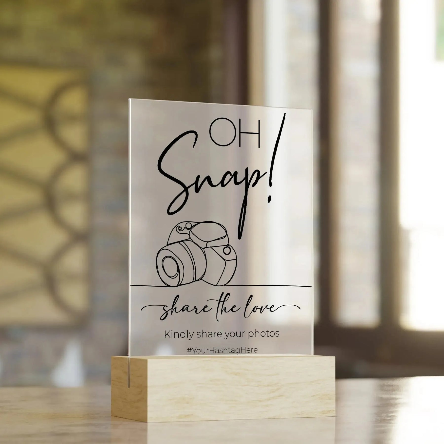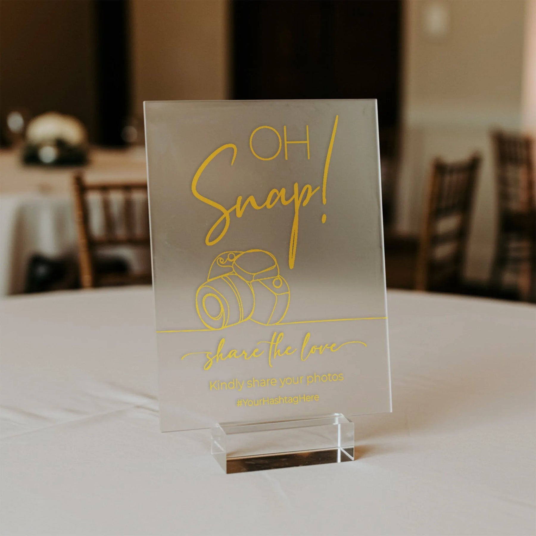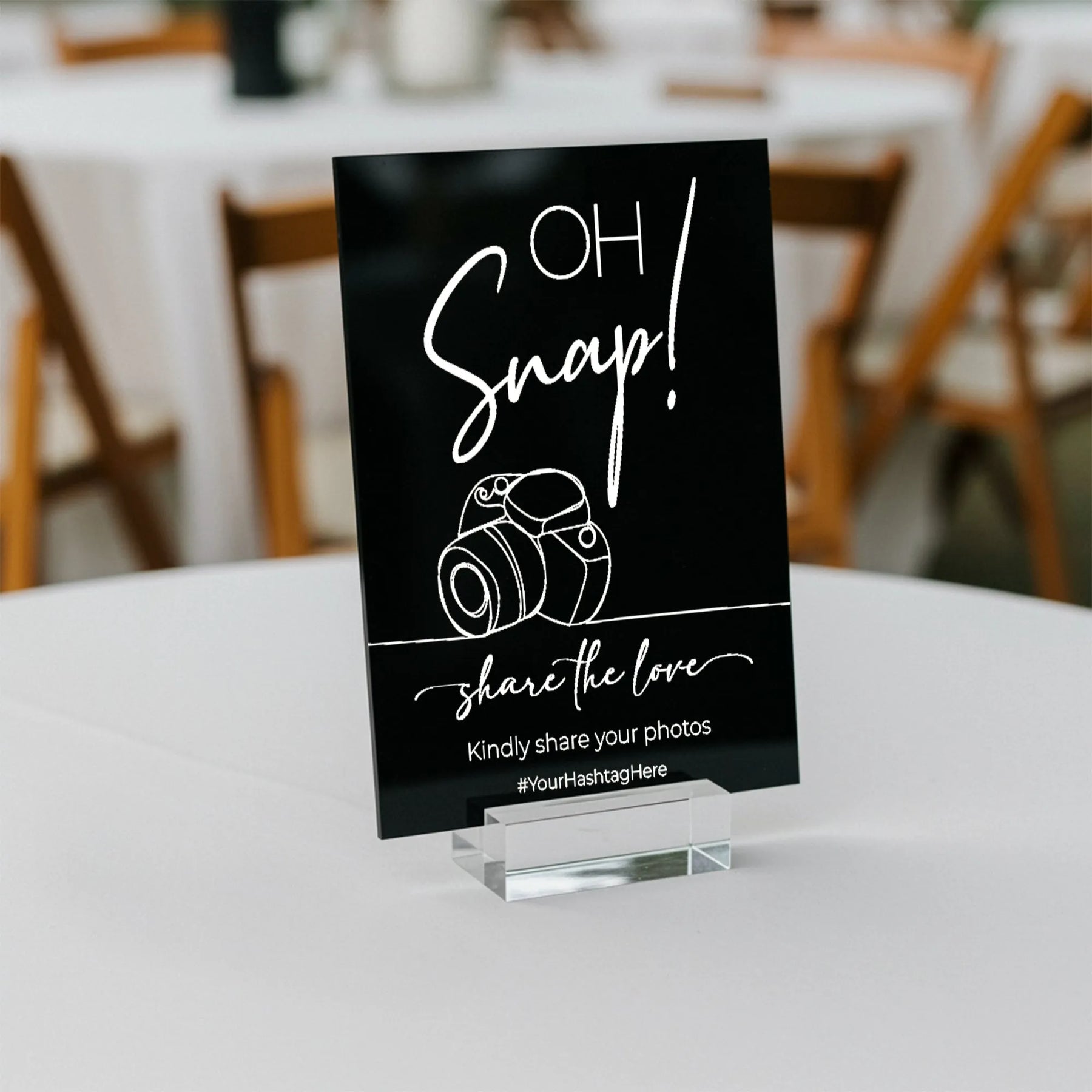 Capture the perfect moments at your wedding with our "Oh Snap" acrylic table sign. Encourage your guests to share their photos using your hashtag to easily find all the memories of your special day. Say cheese!