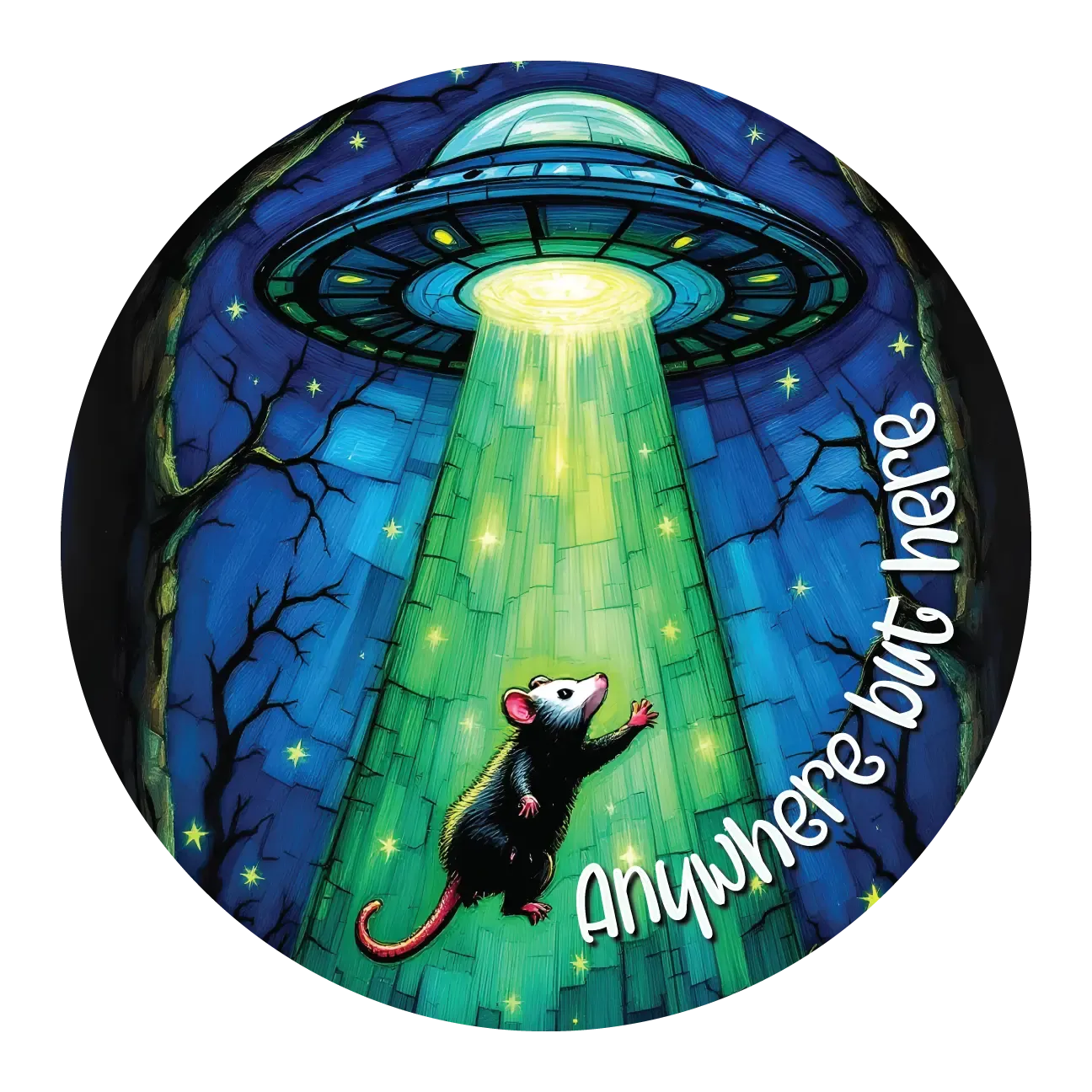 Turn any front door into a portal to escape the monotony of daily life with our Opossum UFO Front Door Decor. Watch as an opossum gets whisked away into a UFO, beckoning you to join in for a wild adventure. Embellished with a wood round sign reading "anywhere but here".