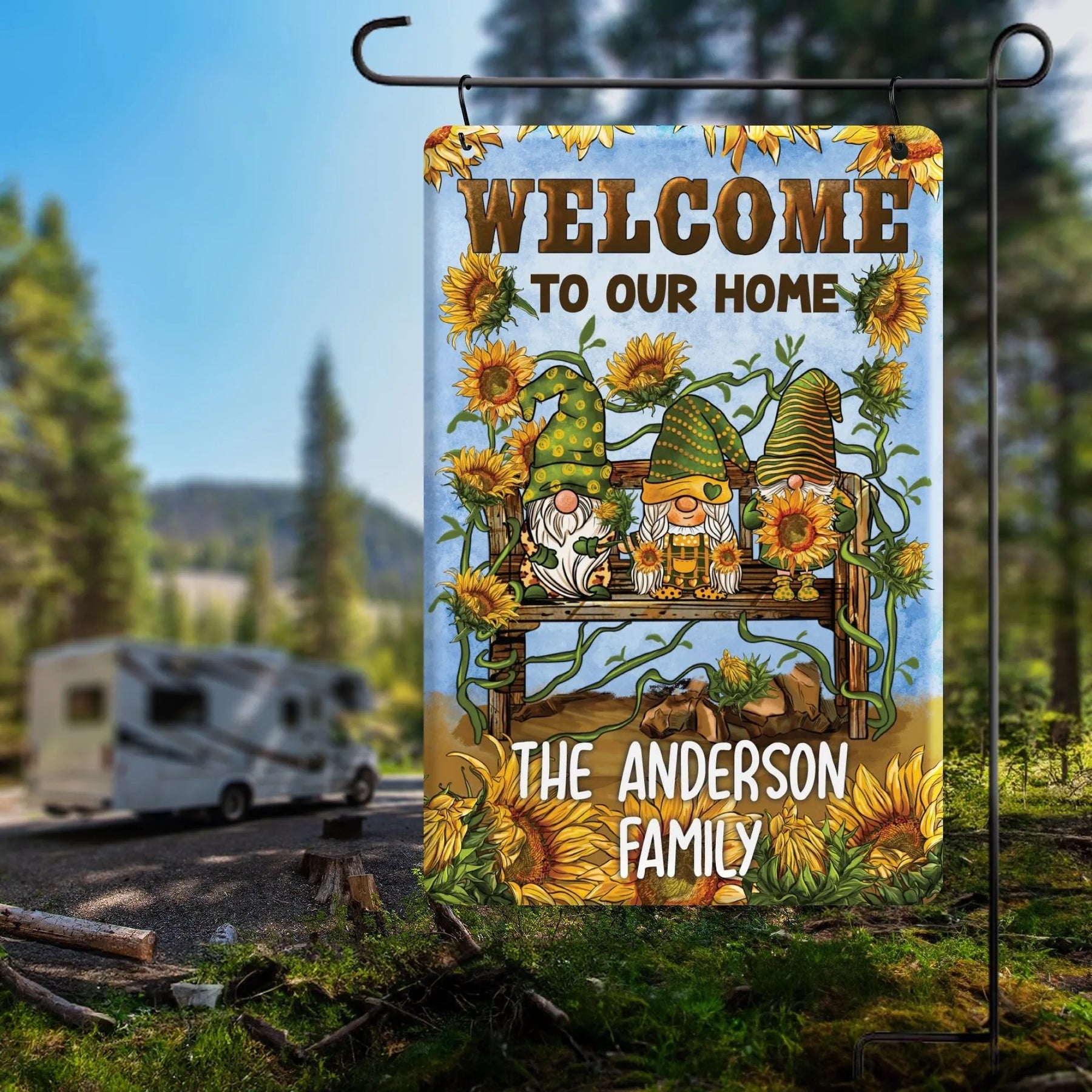 Add a whimsical touch to your garden with our Personalized Sunflower Gnome Home Metal Garden Flag. Featuring three gnomes standing on a bench surrounded by bright sunflowers, this flag welcomes guests with a playful and fun vibe. Make your home stand out with this unique and personalized addition!