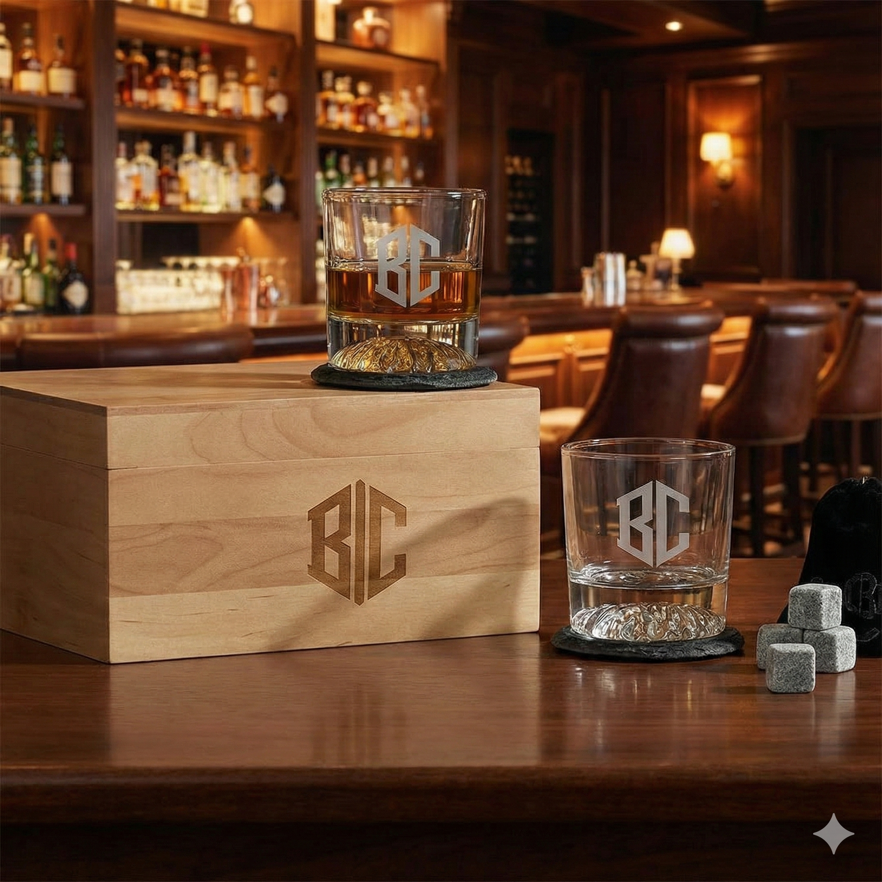 Celebrate sophistication with this personalized whiskey gift set, designed for true connoisseurs. Each set includes two premium rocks glasses, whiskey stones, two slate coasters, and a beautiful wooden keepsake box. Perfect for gifting or personal enjoyment, this set offers both style and practicality for anyone who appreciates fine spirits.