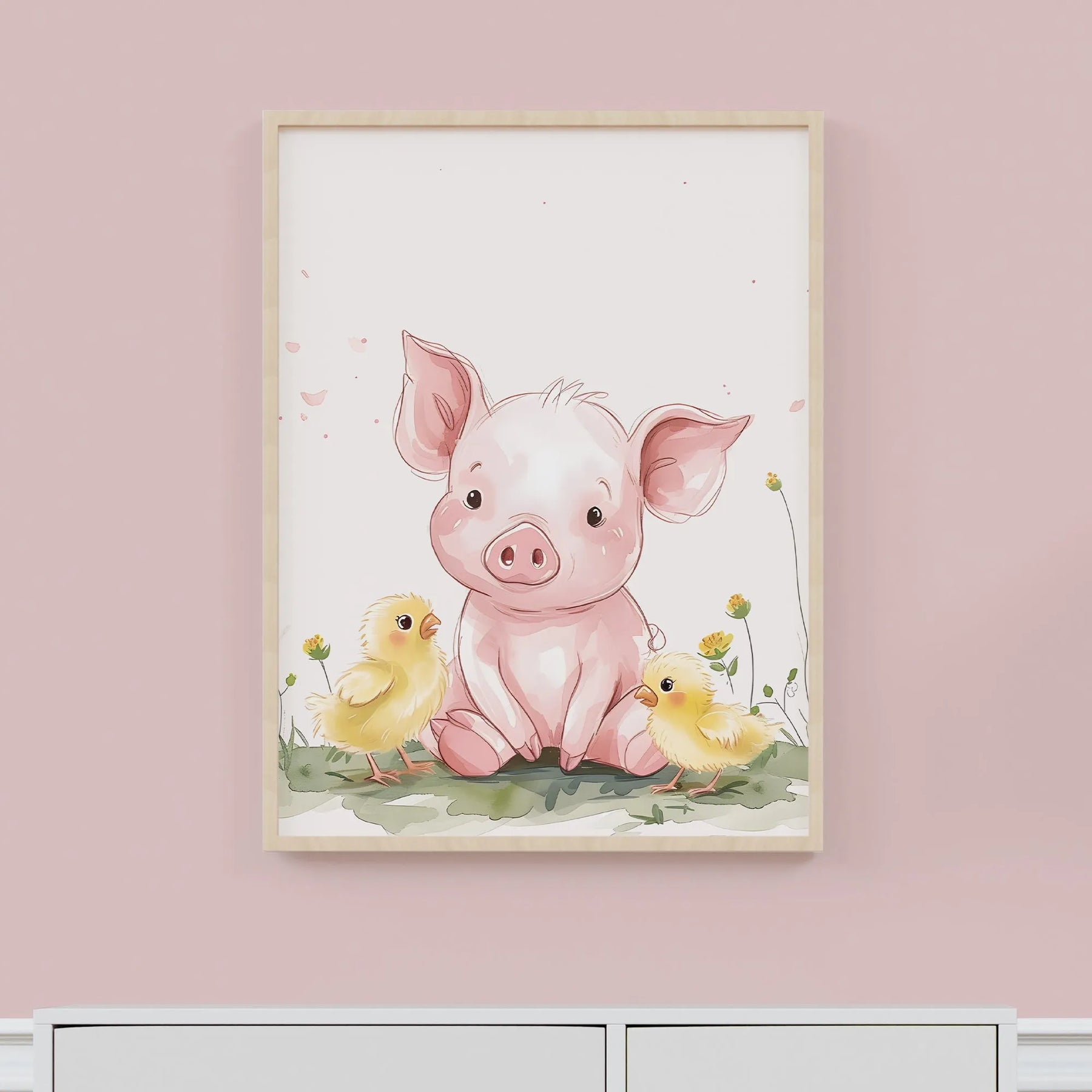 Bring a sweet, playful charm to your child’s room with the Piggy Friends Poster. This adorable nursery art features a cute baby pig surrounded by fluffy yellow chicks, perfect for nurseries or playrooms.