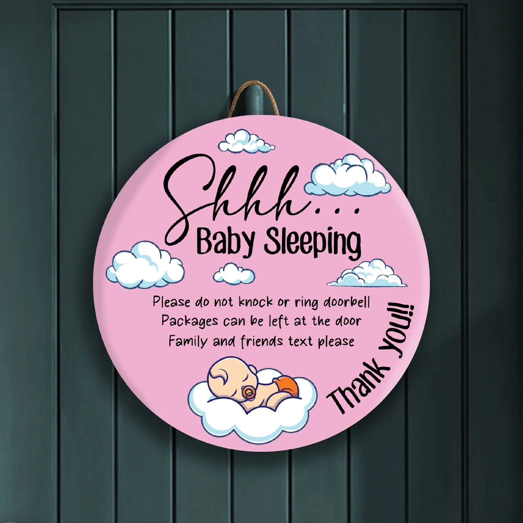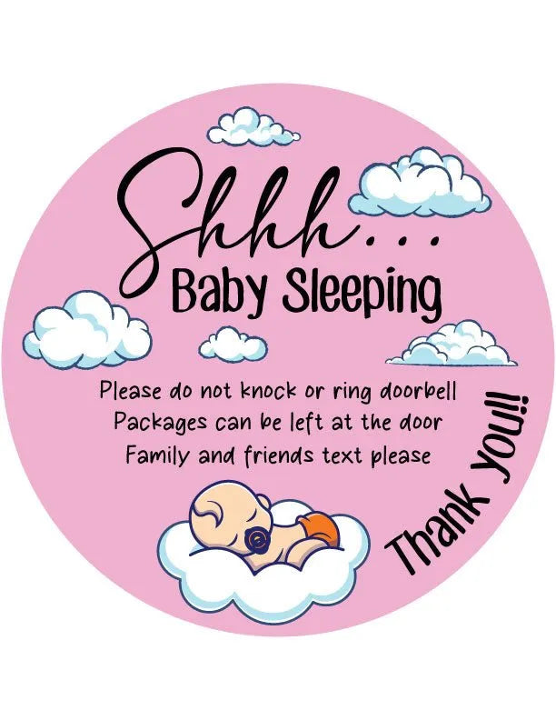 Welcome your guests in a unique way with our Pink Sleeping Baby Front Door Decor! Adorn your door with this darling pink sign that reads "Shh baby sleeping" to politely remind people not to knock or ring the doorbell. Perfect for new parents or anyone who wants to add a touch of playfulness to their home.