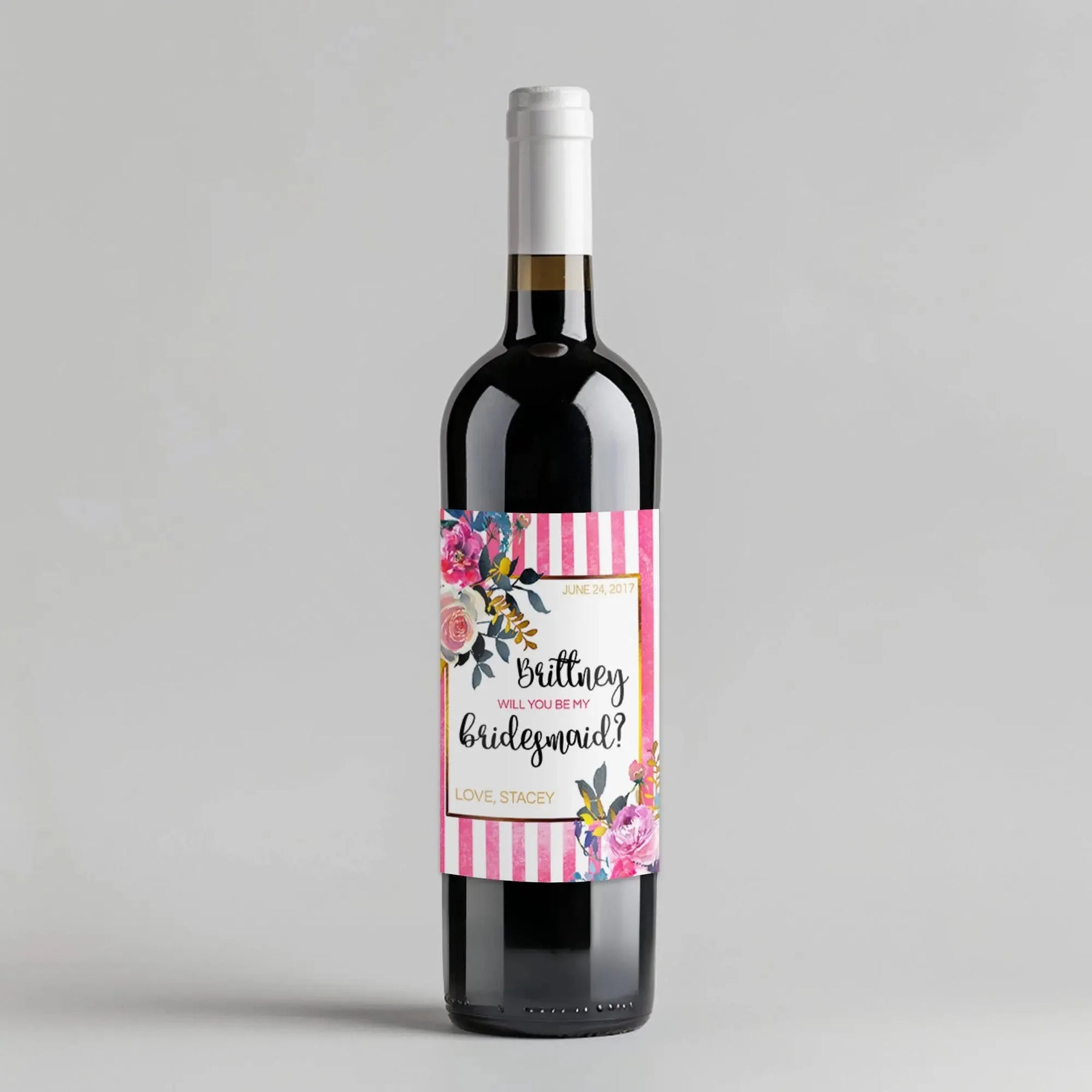 Add a touch of fun to your bridal party with a Pink White Bridesmaid Wine Label. This quirky label is sure to make your bridesmaids feel special (and a little tipsy). No more mix-ups at the reception, just personalized wine bottles for each of your lovely bridesmaids! Cheers!