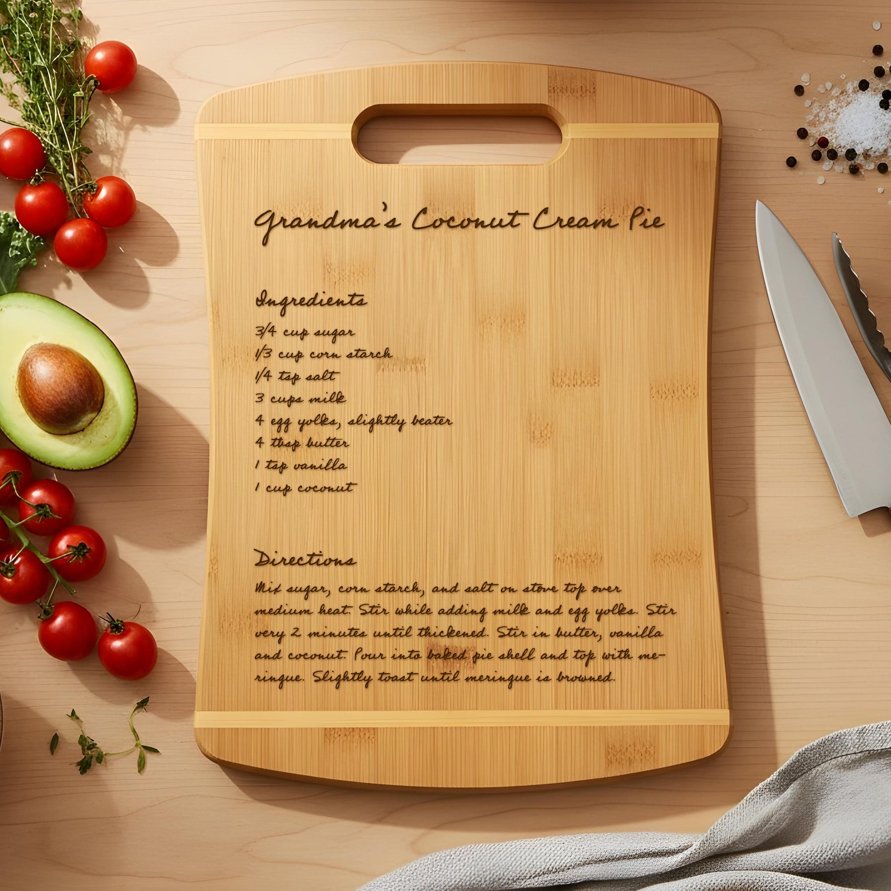 Cook up some nostalgia with this one-of-a-kind bamboo cutting board! Your favorite recipe is beautifully engraved right into the surface, turning meal prep into a trip down memory lane. Perfect for displaying a cherished family recipe or your signature dish, this functional piece doubles as kitchen décor that sparks conversation. Ideal for food lovers, home chefs, and anyone who wants their kitchen to tell their culinary story.