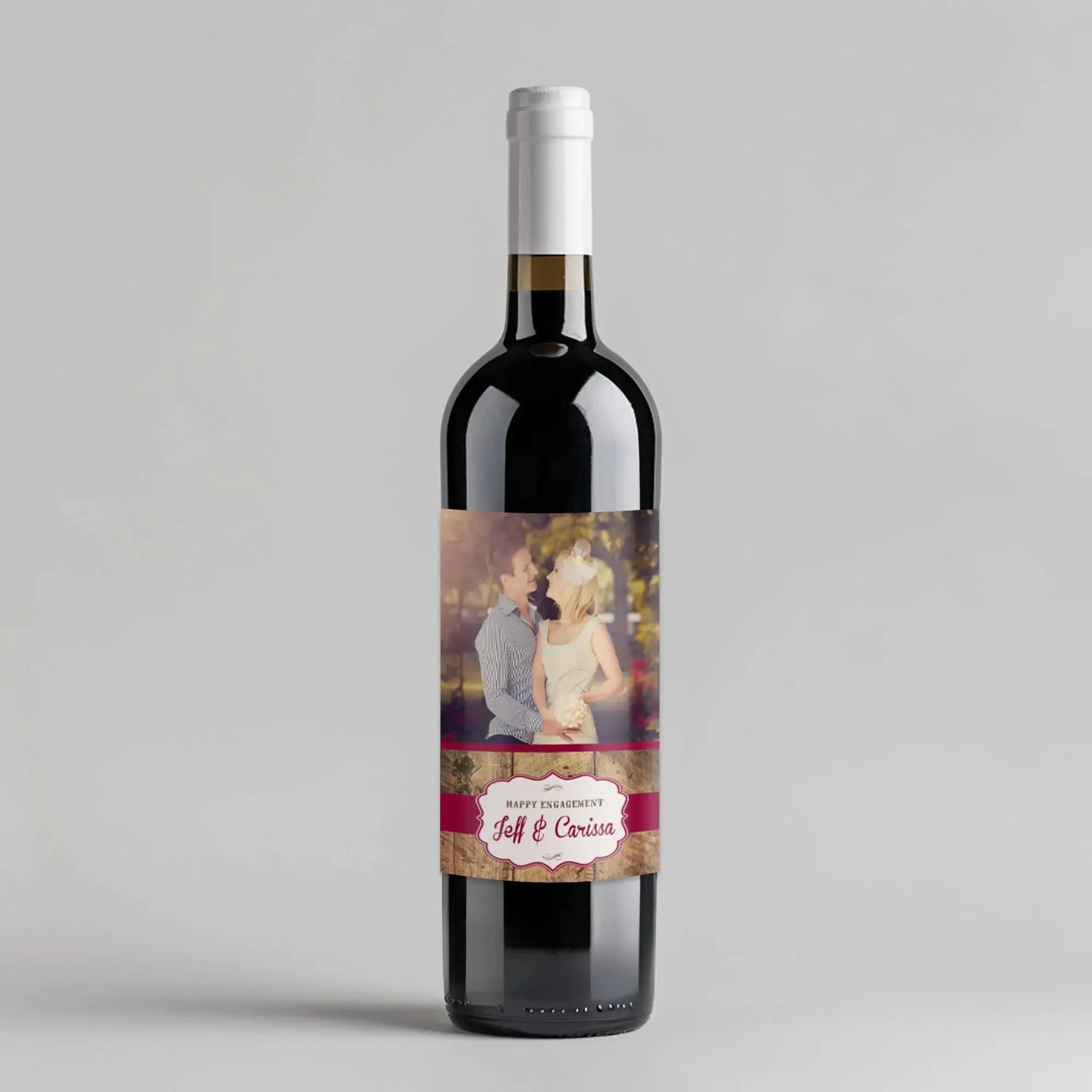 Add a rustic touch to your bridal shower favors with our Wood Maroon Picture Wine Label! Perfect for wine bottles, this label adds a personal touch to your special day. Cheers to love and laughter!