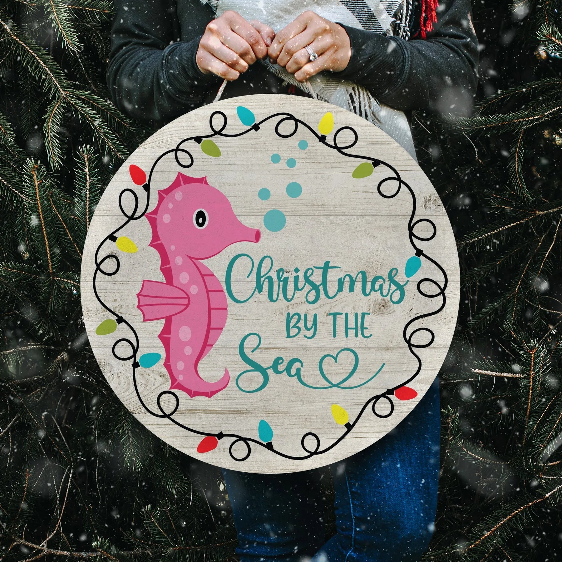 Deck your doors with Christmas cheer and the oceanic style of this Seahorse by the Sea Door Decor! Featuring cheerful Christmas colors and a cute seahorse design, this decoration is sure to bring a splash of fun to your holiday season. Get ready to dive into the spirit of Christmas!