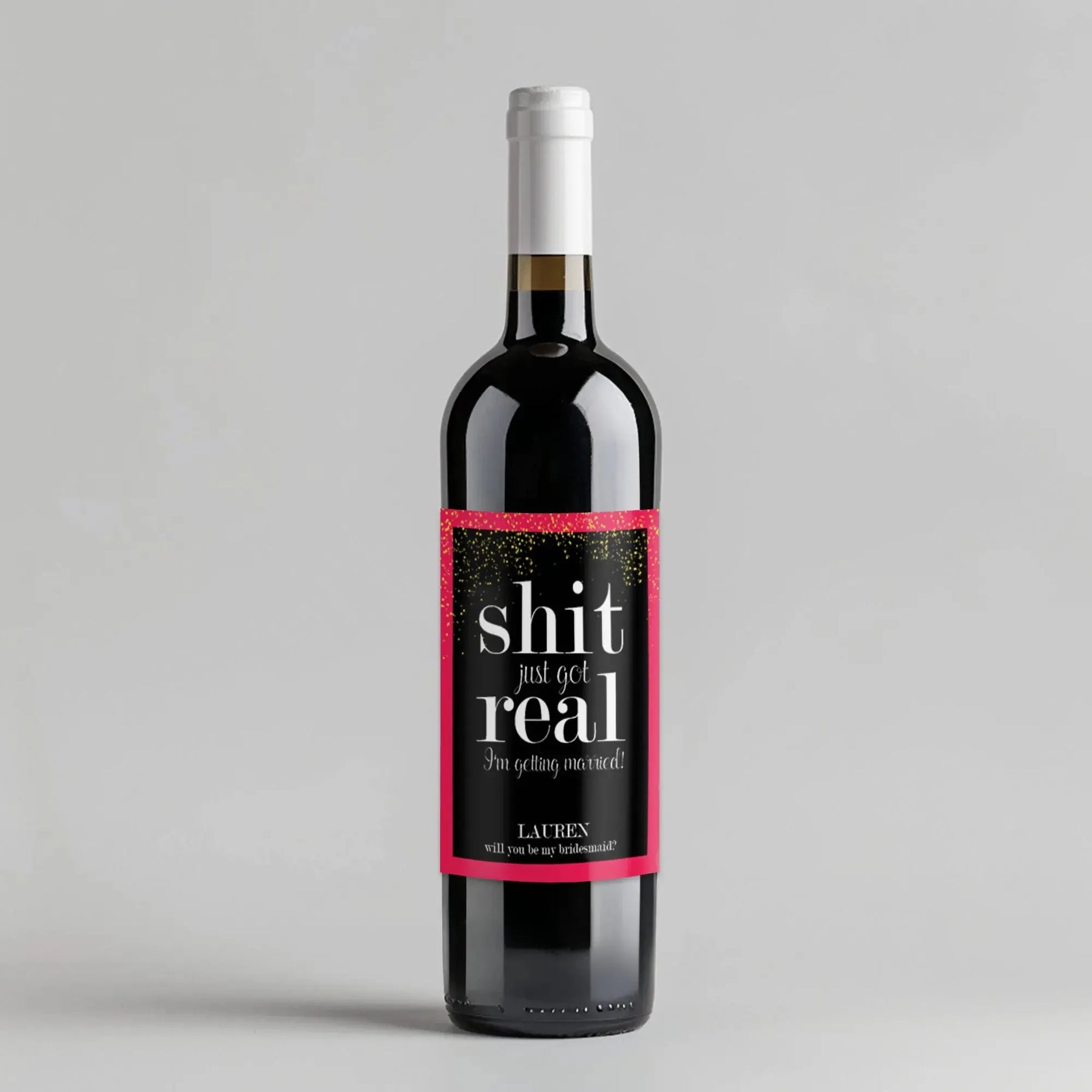 Get ready for some real fun with the Shit Just Got Real Bridesmaid Wine Label! This quirky label is perfect for any bridesmaid, adding a playful touch to any wine bottle. A sure way to bring some humor and personality to your wedding celebrations. Cheers to that!
