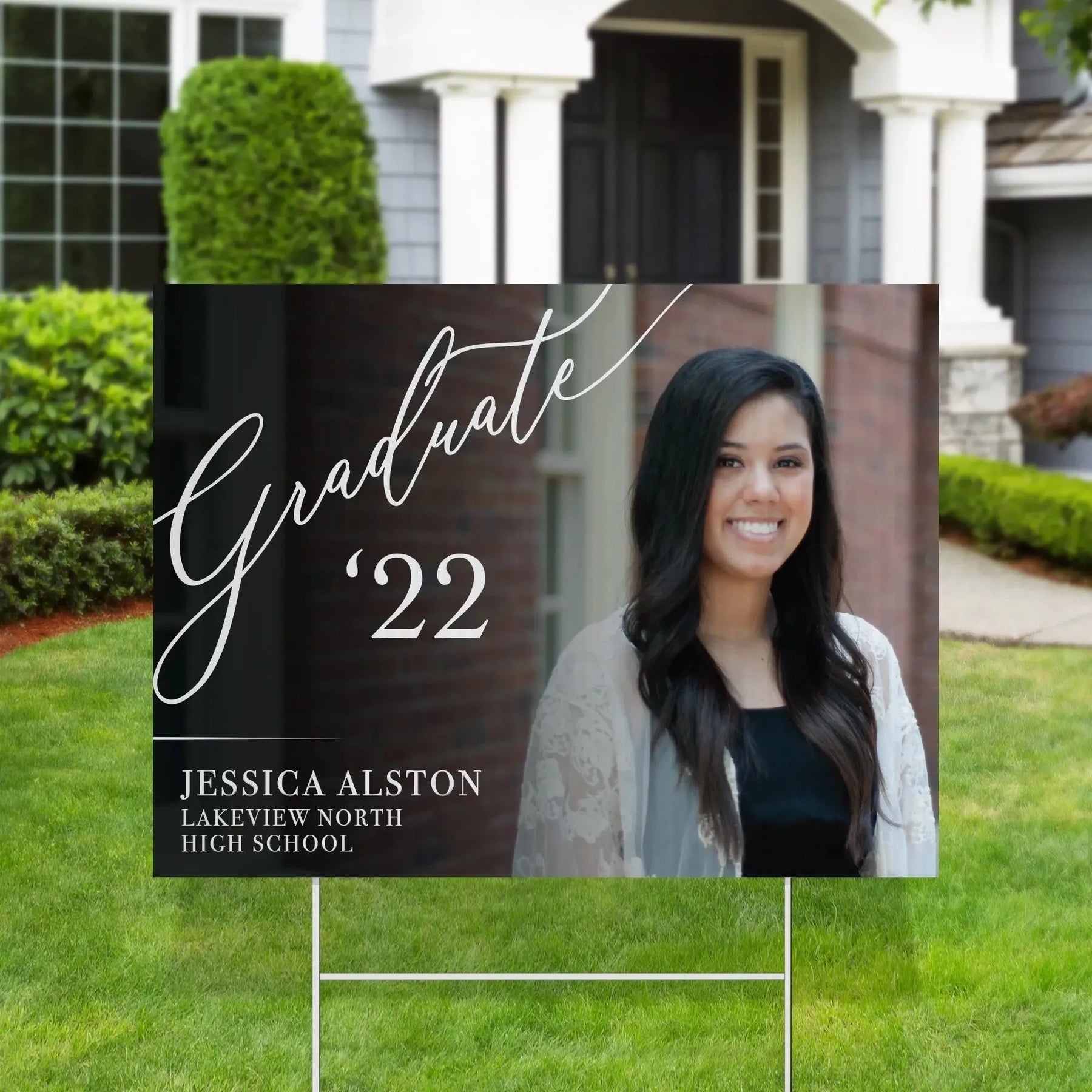 Sign off on senior year with style. Make their name the main event with this custom "Signature" Graduation Yard Sign. Featuring their name in a fluid, modern script font (reminiscent of a celebrity autograph) alongside their senior portrait, this weather-resistant sign turns a standard announcement into a chic personal statement for the Class of 2025.