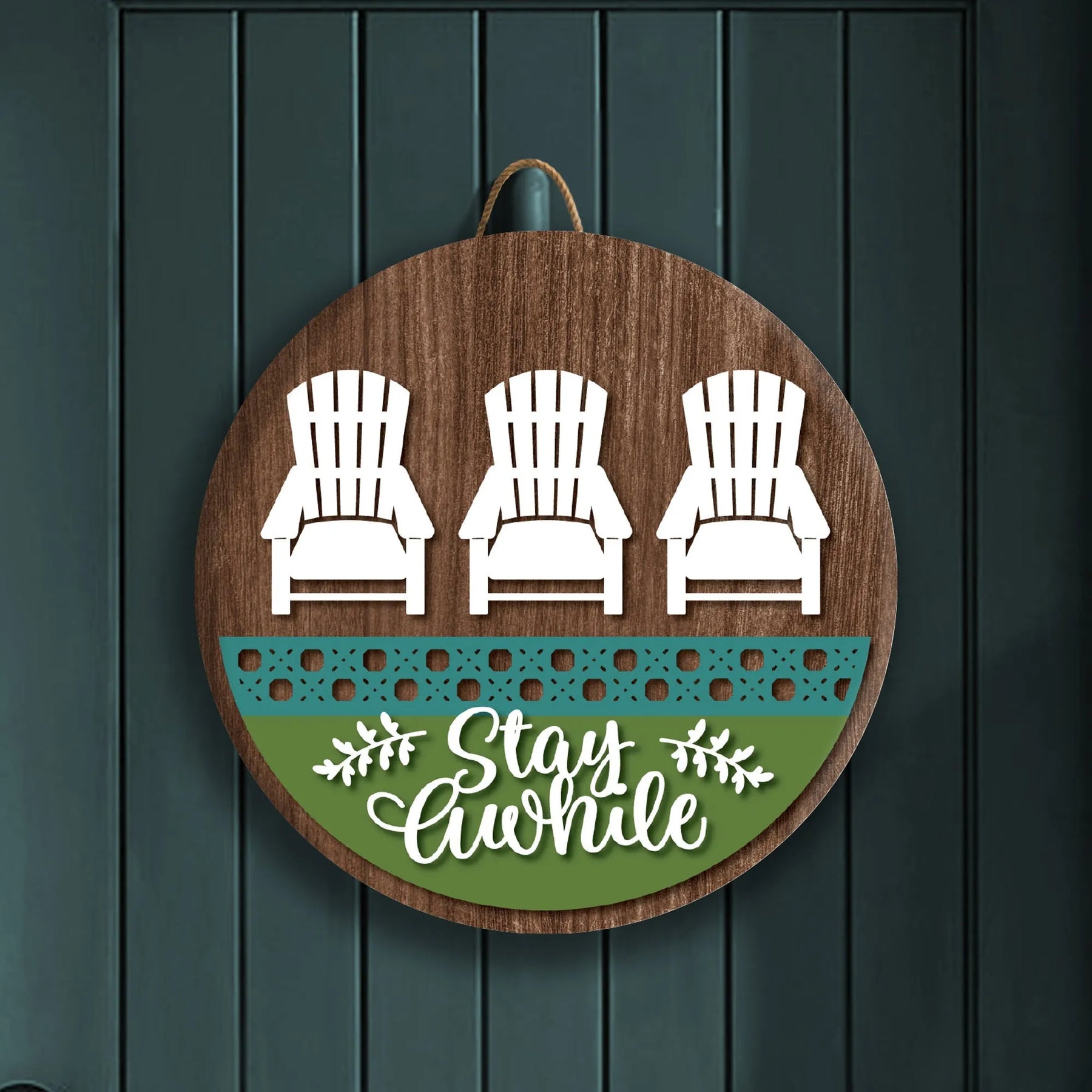 Welcome guests to stay a while with this charming, playful front door sign. Let them know you're happy to have them with a playful stay awhile message. Perfect for adding a cheerful touch of personality to your front door!