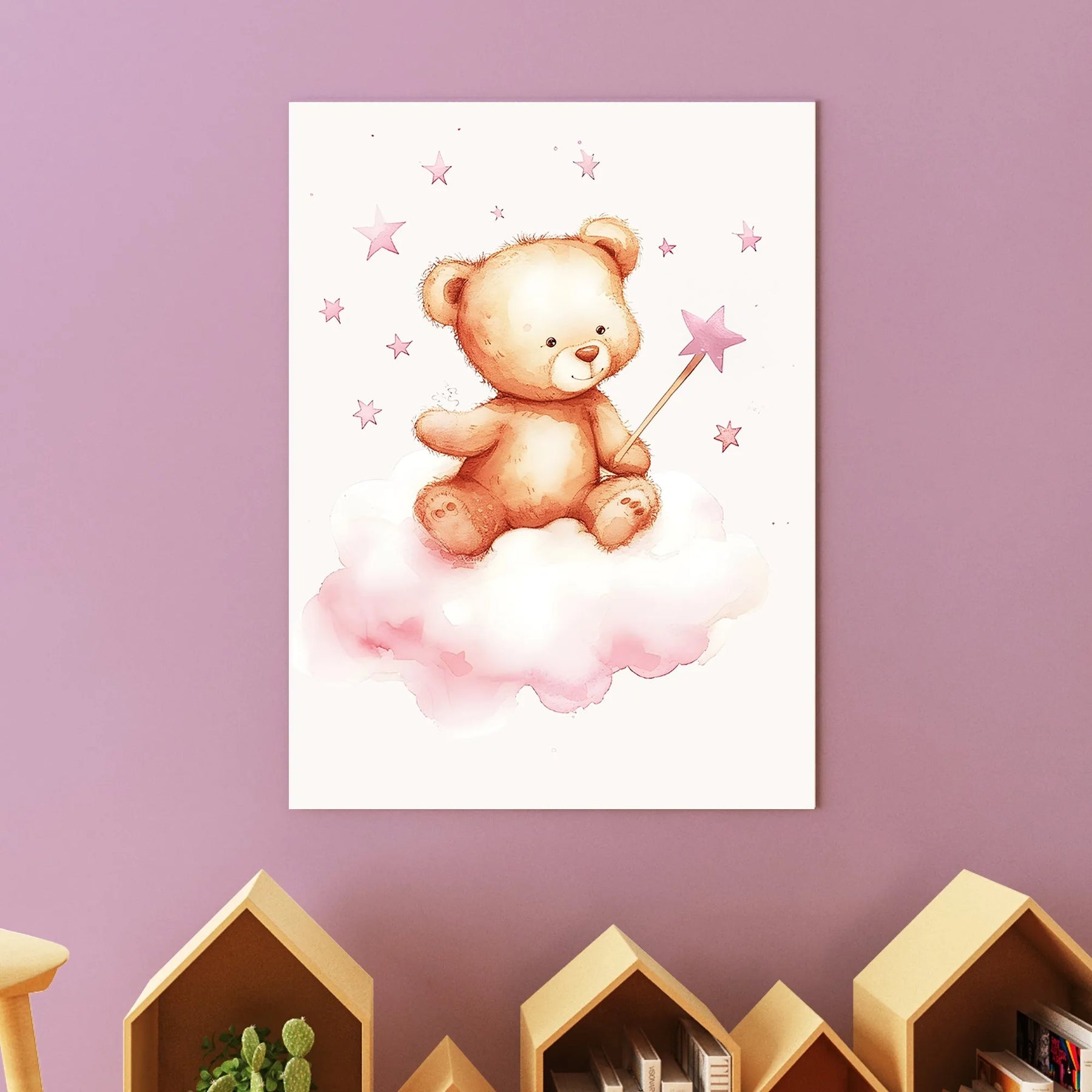 Teddy Bear with Wand Nursery Poster – Cute Kids Room Wall Art with Stars and Clouds - iCustomLabel