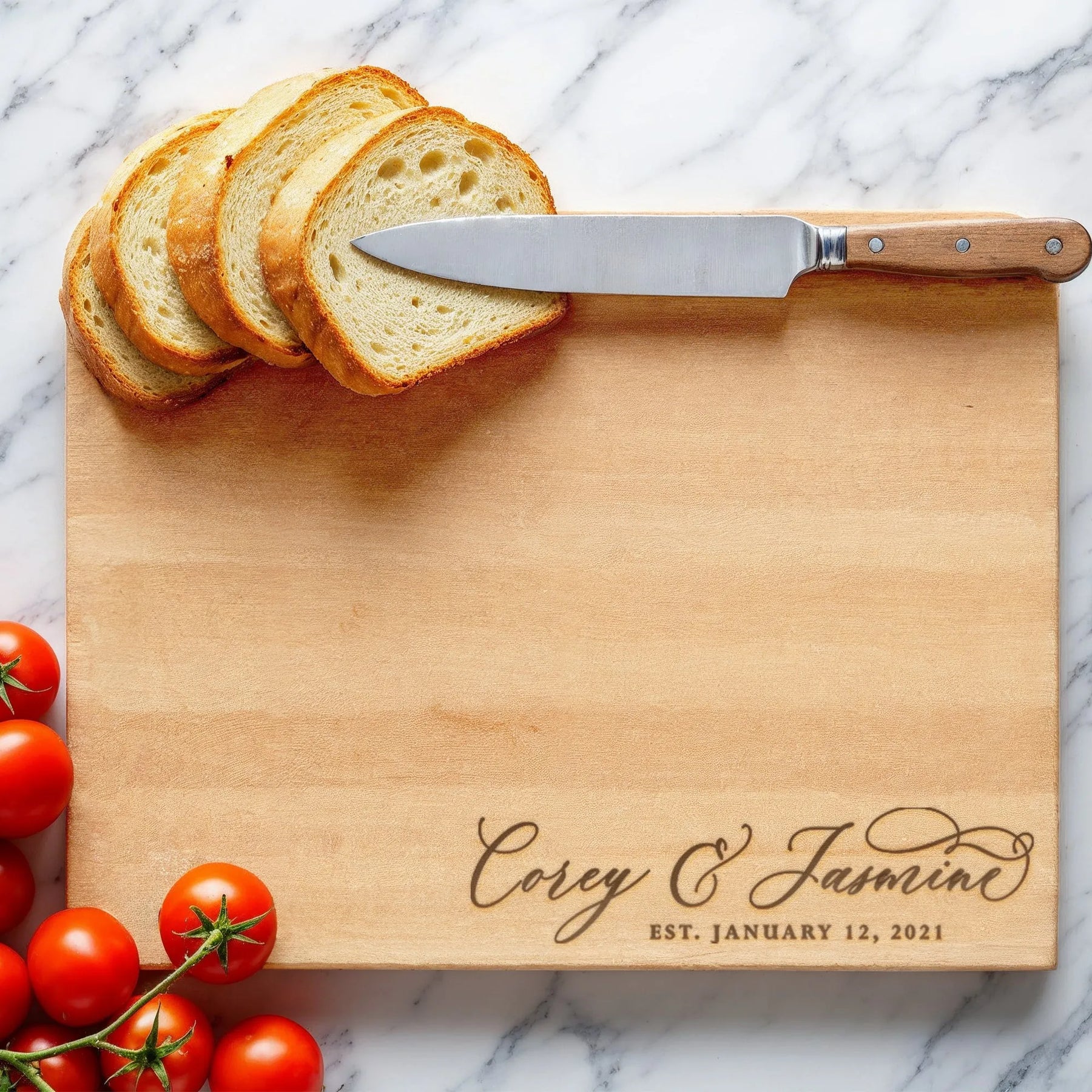 Our Traditional Script Couples Cutting Board is a perfect gift for couples. Made from premium wood, it features an elegant script engraving of the couple's names. Ideal for food preparation and serving, this cutting board adds a touch of personalization and elegance to any kitchen.