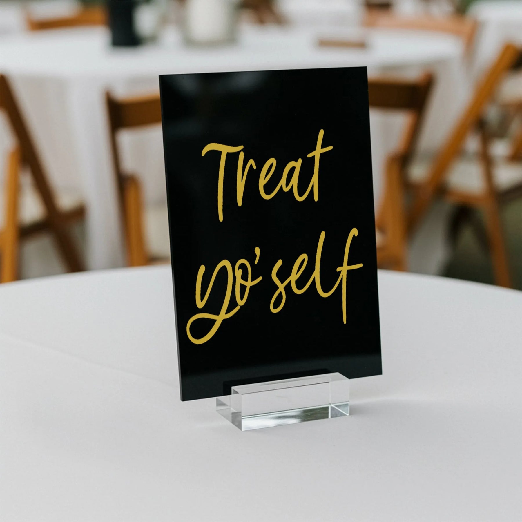 A fun pop-culture reference on acrylic for the dessert or favor table. "Treat Yo Self" encourages guests to indulge.