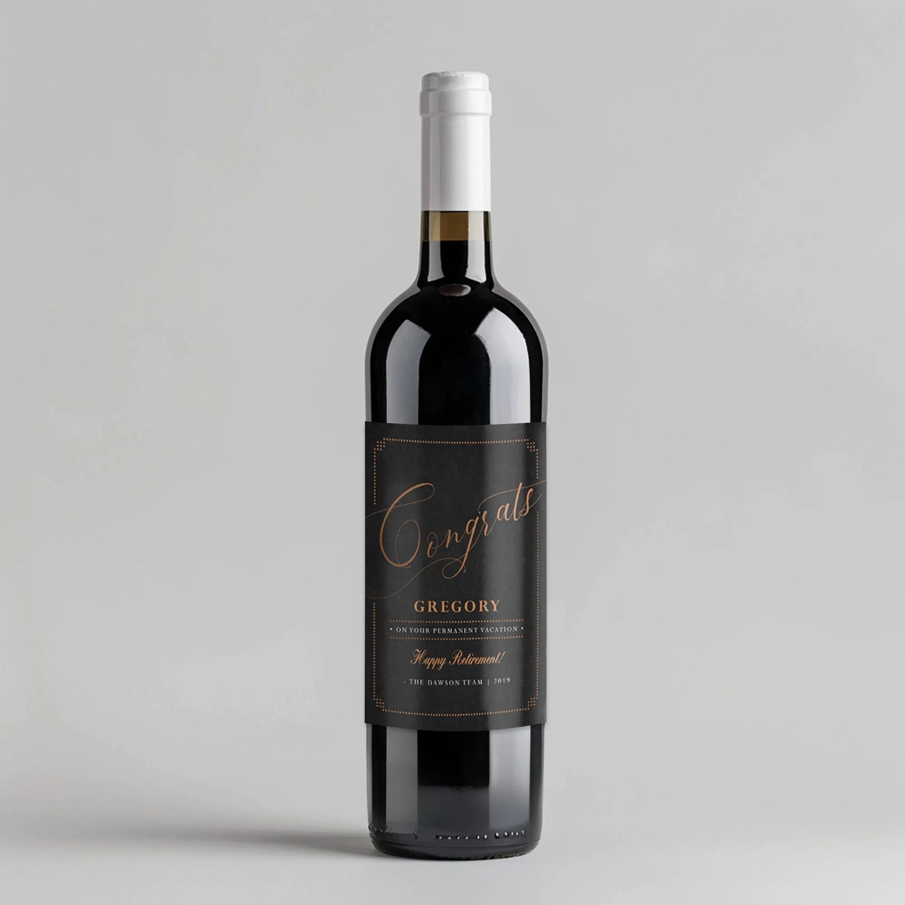 Retire in style with our Vacation Retirement Wine Label! Personalized with a sleek black design, this label will make any bottle of wine the talk of the party. Cheers to new adventures!