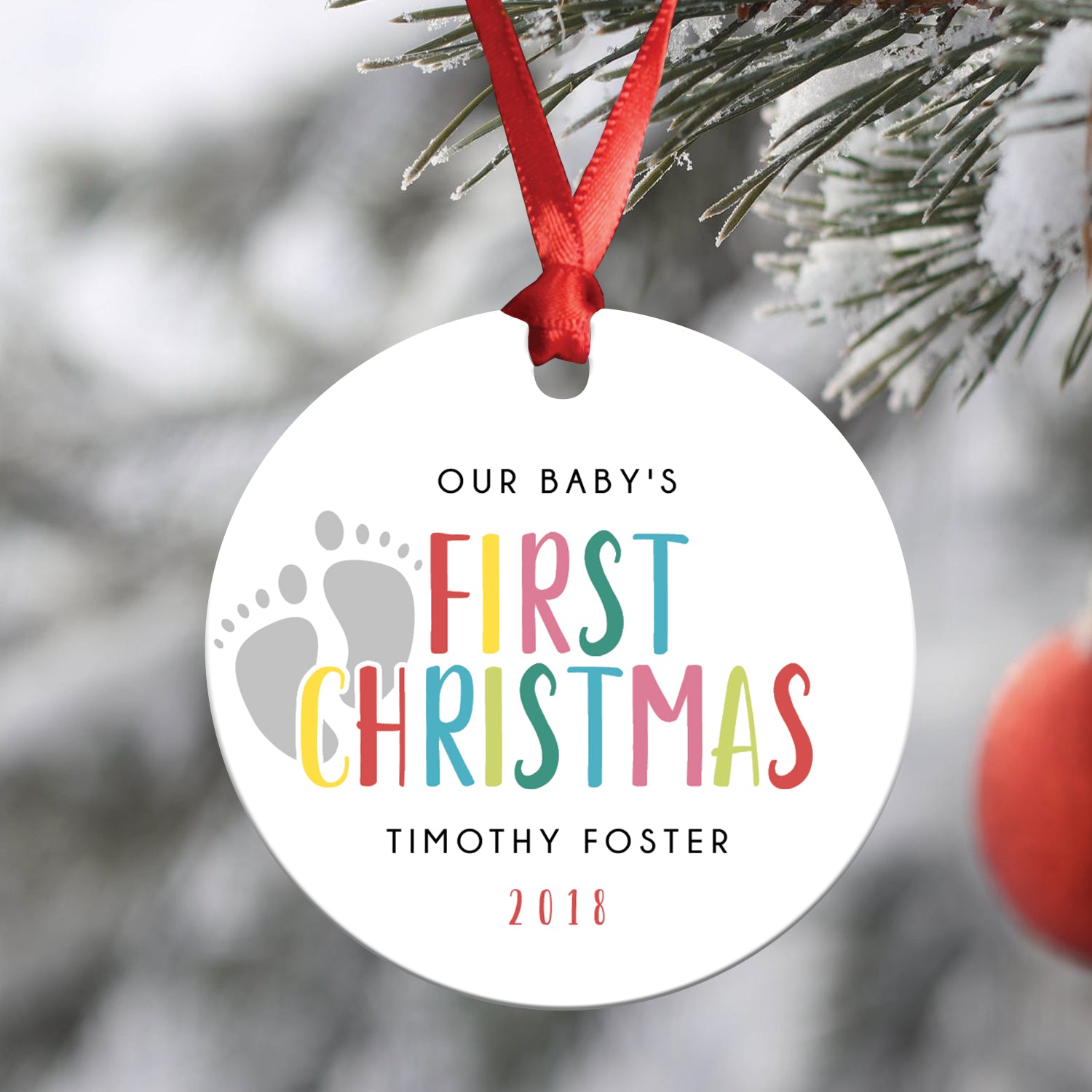 Celebrate your baby's first holiday with the Vibrant Baby First Christmas Ornament. Featuring a colorful design, this ornament is perfect for marking this special milestone. Customize with your baby's name and year.