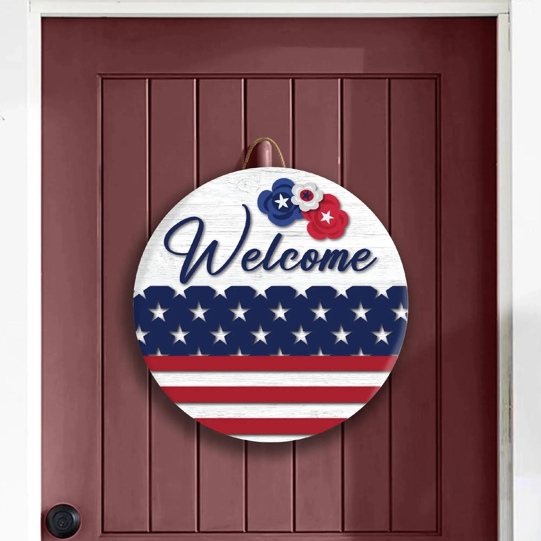 Make a patriotic statement with our Welcome USA House Front Door Sign. Featuring a charming design of red, white, and blue flowers and a flag, this sign adds a touch of Americana to any home. Greet your guests with a warm welcome and show your pride with this eye-catching piece.